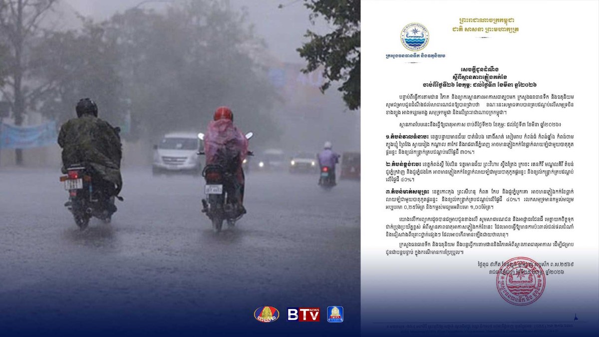 ក្រសួងធនធានទឹក៖ សម្ពាធទាបបានគ្របដណ្តប់លើសមុទ្រចិនខាងត្បូង កម្ពុជានឹង​រង​ស្ថានភាព​ភ្លៀងកក់ខែ ចាប់ពីថ្ងៃទី២៦ ខែកុម្ភៈ ដល់ថ្ងៃទី៣ ខែមីនា ឆ្នាំ២០២៦