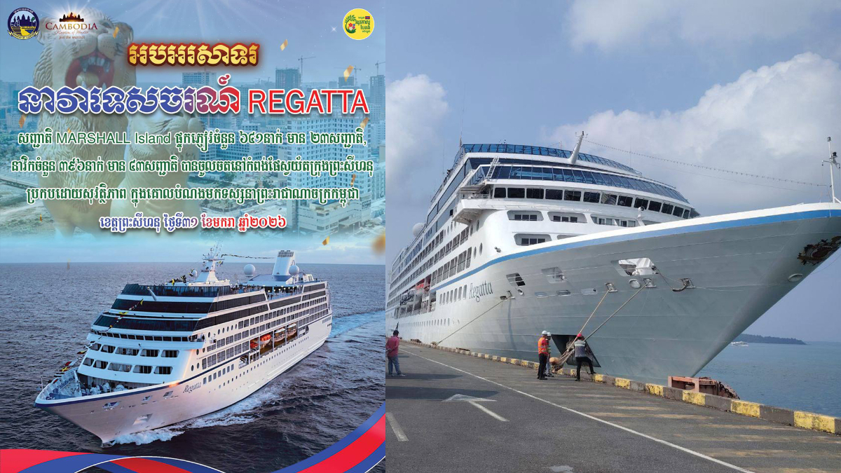 ខេត្តព្រះសីហនុ ថ្ងៃទី៣១ ខែមករា ឆ្នាំ២០២៦ ក្រោមការចង្អុលបង្ហាញពីឯកឧត្តម ហួត ហាក់ រដ្ឋមន្ត្រីក្រសួងទេសចរណ៍ មន្ទីរទេសចរណ៍ខេត្តព្រះសីហនុ បានអញ្ជើញទទួលស្វាគមន៍យ៉ាងកក់ក្តៅដល់ភ្ញៀវទេសចរ ចំនួន ៦៤១នាក់ ដែលមាន ២៣សញ្ជាតិ និងនាវិកចំនួន ៣៩៦នាក់ ដែលមាន ៤៣សញ្ជាតិ បានចុះពីនាវាទេសចរណ៍ REGATTA សញ្ជាតិ MARSHALL Island មានបណ្តោយប្រវែង ១៨០.៤៥ម៉ែត្រ និងទទឹងប្រវែង ២៥.៤៦ម៉ែត្រ ជម្រៅ ៦ម៉ែត្រ និងបានចង្អុលណែនាំអំពីតំបន់សក្តានុពលទេសចរណ៍សំខាន់ៗរបស់ខេត្តព្រះសីហនុ ជូនភ្ញៀវបានយ៉ាងល្អប្រសើរ។