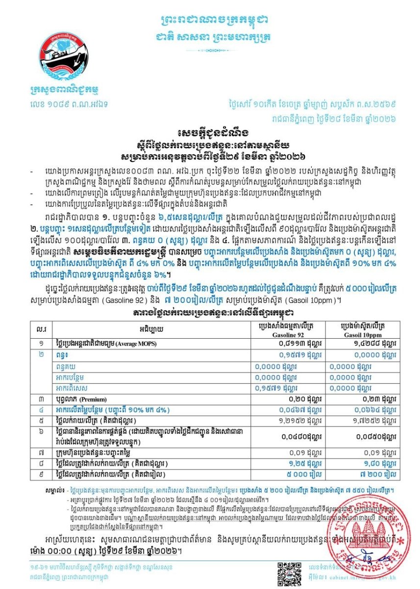 ក្រសួងពាណិជ្ជកម្ម បានចេញសេចក្តីជូនដំណឹង ស្តីពីថ្លៃលក់រាយប្រេងឥន្ធនៈនៅតាមស្ថានីយ សម្រាប់ការអនុវត្តចាប់ពីម៉ោង ០០:០០ (សូន្យ) ថ្ងៃទី២៩ ខែមីនា ឆ្នាំ២០២៦ រហូតដល់ថ្ងៃជូនដំណឹងបន្ទាប់ ក្នុងនោះ តម្លៃសាំងចុះថ្លៃ ៤៥០ រៀល ខណៈម៉ាស៊ូតឡើងថ្លៃ ១០០ រៀល។