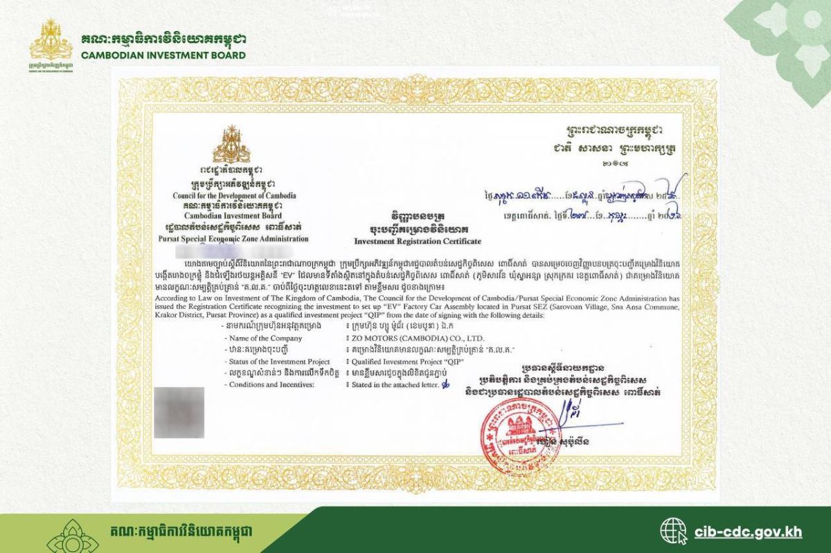 យោងតាមឯកសារផ្លូវការដែលចេញផ្សាយដោយគណៈកម្មាធិការវិនិយោគកម្ពុជា (CIB) នៃក្រុមប្រឹក្សាអភិវឌ្ឍន៍កម្ពុជា (CDC) កាលពីពេលថ្មីៗនេះ គម្រោងបង្កើតរោងចក្របង្គុំ និងតម្លើងរថយន្តពាណិជ្ជកម្មថាមពលថ្មីរបស់ក្រុមហ៊ុន ZO MOTORS ដែលមានទីតាំងស្ថិតក្នុងតំបន់សេដ្ឋកិច្ចពិសេសក្នុងស្រុកក្រគរ ខេត្តពោធិ៍សាត់ ត្រូវបានអនុម័ត និងផ្តល់អាជ្ញាប័ណ្ណជាផ្លូវការហើយ។ ក្នុងនាមជារោងចក្របង្គុំ និងតម្លើងរថយន្តពាណិជ្ជកម្មអគ្គិសនីខ្នាតធំដំបូងគេបង្អស់នៅកម្ពុជាការឈានដល់ដំណាក់កាលនេះគឺជាសញ្ញាដ៏សំខាន់នៃការផ្លាស់ប្តូរមុខមាត់ឧស្សាហកម្មបៃតង និងការផលិតគ្រឿងចក្រកម្រិតខ្ពស់នៅក្នុងព្រះរាជាណាចក្រកម្ពុជា។