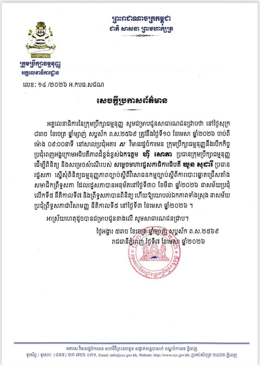 អគ្គលេខាធិការនៃក្រុមប្រឹក្សាធម្មនុញ្ញ បានឲ្យដឹងថា នៅថ្ងៃទី១០ ខែមេសា ឆ្នាំ២០២៦ ចាប់ពី ម៉ោង ០៩:០០នាទី នៅសាលប្រជុំអគារ ស វិមានរដ្ឋចំការមន ក្រុមប្រឹក្សាធម្មនុញ្ញនឹងបើកកិច្ច ប្រជុំពេញអង្គក្រោមអធិបតីភាពដ៏ខ្ពង់ខ្ពស់ឯកឧត្តម ហ៊ី សោភា ប្រធានក្រុមប្រឹក្សាធម្មនុញ្ញ ដើម្បីពិនិត្យ និងសម្រេចសំណើរបស់ សម្តេចមហារដ្ឋសភាធិការធិបតី ឃួន សុដារី ប្រធាន រដ្ឋសភា ស្នើសុំពិនិត្យធម្មនុញ្ញភាពច្បាប់ស្តីពីវិសោធនកម្មច្បាប់ស្តីពីការបោះឆ្នោតជ្រើសតាំង សមាជិកព្រឹទ្ធសភា ដែលរដ្ឋសភាបានអនុម័តនៅថ្ងៃទី៣០ ខែមីនា ឆ្នាំ២០២៦ នាសម័យប្រជុំ លើកទី៥ នីតិកាលទី៧ និងព្រឹទ្ធសភាបានពិនិត្យ ហើយឱ្យយោបល់ឯកភាពទាំងស្រុង នាសម័យ ប្រជុំព្រឹទ្ធសភាជាវិសាមញ្ញ នីតិកាលទី៥ នៅថ្ងៃទី៣ ខែមេសា ឆ្នាំ២០២៦។