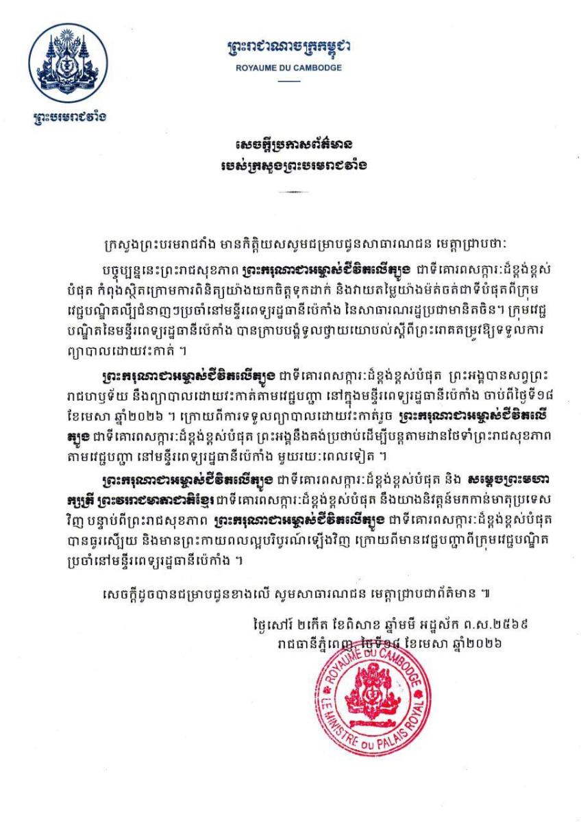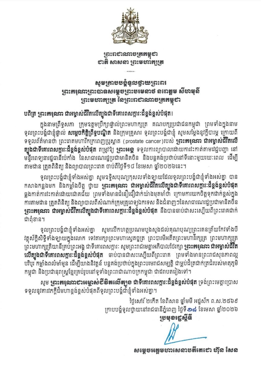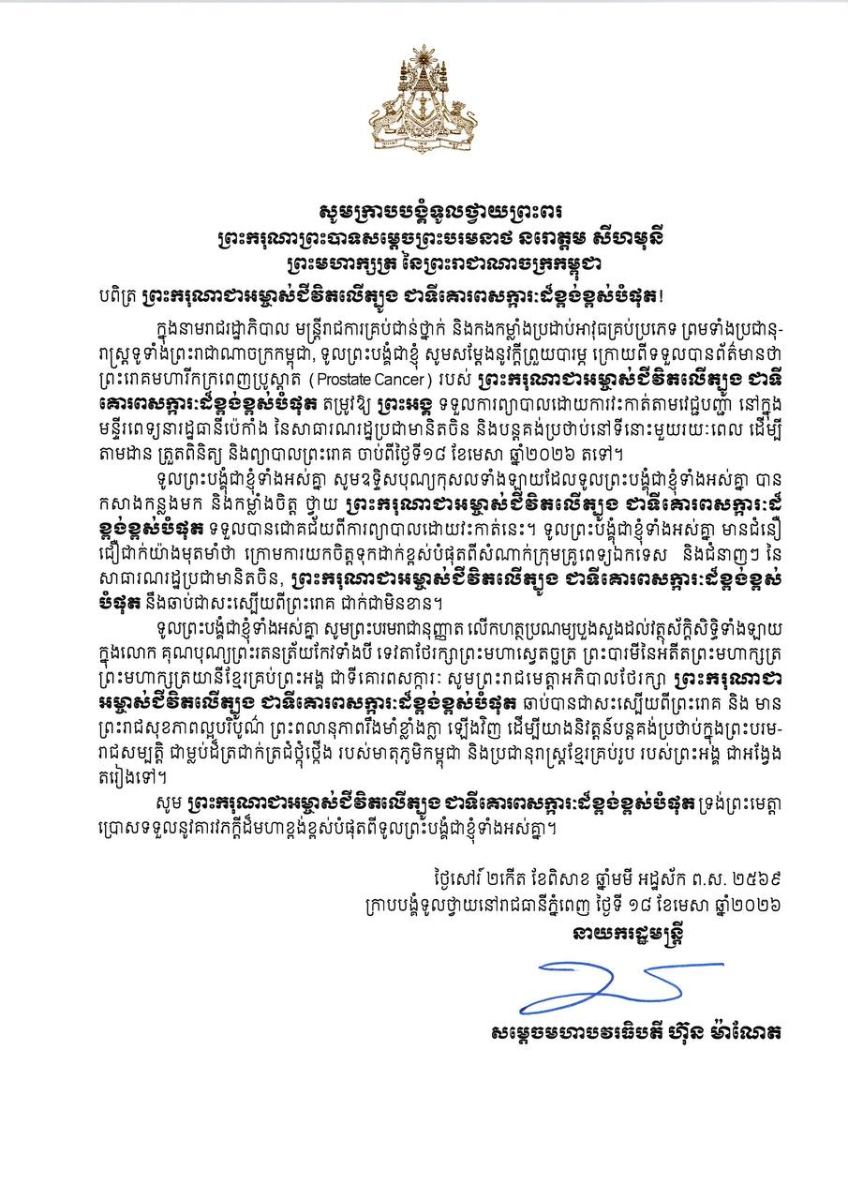 តាមរយៈសារលិខិតថ្វាយព្រះករុណា ព្រះមហាក្សត្រនៃយើង សម្ដេចតេជោ ប្រមុខរដ្ឋស្ដីទី និង​សម្ដេច​មហា​បវរធិបតី ហ៊ុន ម៉ាណែត ក្នុងនាមព្រឹទ្ធសភា ក្រុមឧត្តមប្រឹក្សាផ្ទាល់ព្រះមហាក្សត្រ គណ​បក្ស​ប្រជាជនកម្ពុជា ព្រមទាំងក្នុងនាម សម្ដេចតេជោផ្ទាល់ សម្តេចកិត្តិព្រឹទ្ធបណ្ឌិត និង​ក្រុម​គ្រួសារ ​និងសម្ដេចធិបតី ក្នុងនាមរាជរដ្ឋាភិបាល និងសម្ដេចផ្ទាល់ បានសម្តែងនូវក្តីបារម្ភ ក្រោយ​ពី​ទទួល​ព័ត៌មាន​ថា ព្រះរោគមហារីកក្រពេញប្រូស្តាត (prostate cancer) របស់ព្រះករុណា​ជា​អម្ចាស់​ជីវិត​លើ​ត្បូង​ជា​ទីគោរព​សក្ការៈ​ដ៏​ខ្ពង់​ខ្ពស់​បំផុត​តម្រូវ​ឱ្យ​ព្រះអង្គ​ទទួល​ការ​ព្យាបាល​ដោយ​ការ​វះកា​ត់​តាមវេជ្ជបញ្ជានៅមន្ទីរពេទ្យនារដ្ឋធានីប៉េកាំង នៃសាធារណរដ្ឋប្រជាមានិតចិន និង​បន្ត​គង់​ប្រថាប់នៅ​ទីនោះមួយរយៈពេល ដើម្បីតាមដាន ត្រួតពិនិត្យ និងព្យាបាលព្រះរោគ ចាប់​ពី​ថ្ងៃ​ទី​១៨ ​ខែមេសា ឆ្នាំ២០២៦នេះ។