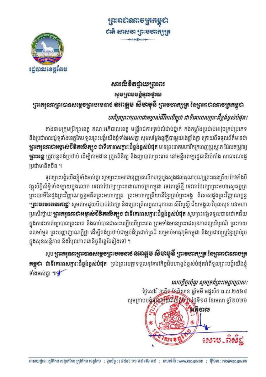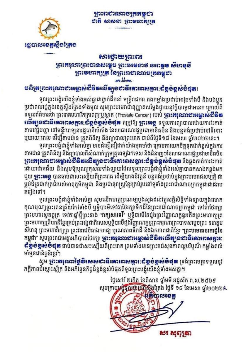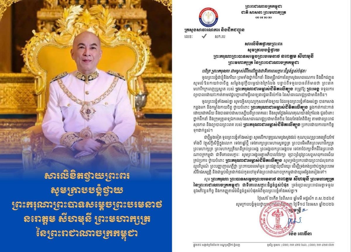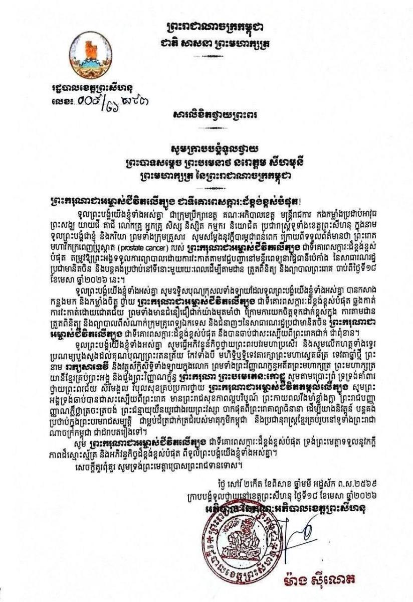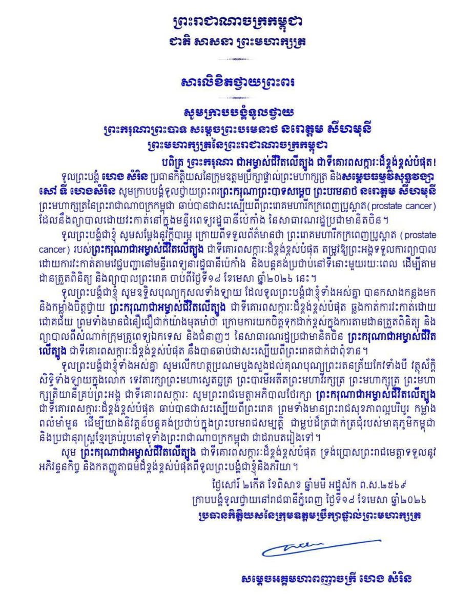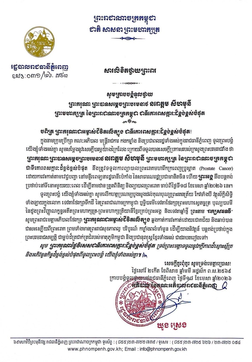 បណ្ដាក្រសួង ស្ថាប័ន មន្ត្រីរាជការគ្រប់ជាន់ថ្នាក់ និងកងកម្លាំងប្រដាប់អាវុធគ្រប់ប្រភេទ ព្រម​ទាំង​ប្រជានុរាស្ត្រទូទាំងព្រះរាជាណាចក្រកម្ពុជា, បានសម្តែងនូវក្តីព្រួយបារម្ភ ក្រោយ​ពី​ទទួល​បាន​ព័ត៌មា​នថា ព្រះរោគមហារីកក្រពេញប្រូស្អាត (Prostate Cancer) របស់ព្រះ​ករុណា​ជា​អម្ចាស់​ជីវិត​លើ​ត្បូង ជាទីគោរពសក្ការៈដ៏ខ្ពង់ខ្ពស់បំផុត តម្រូវឱ្យ ព្រះអង្គ ទទួលការព្យាបាល​ដោយ​ការ​វះ​កាត់​តាម​វេជ្ជបញ្ជានៅក្នុង មន្ទីរពេទ្យនារដ្ឋធានីប៉េកាំង នៃសាធារណរដ្ឋប្រជាមានិតចិន និង​បន្ត​គង់​ប្រថាប់​នៅទីនោះមួយរយៈពេល ដើម្បី តាមដាន ត្រួតពិនិត្យ និងព្យាបាលព្រះរោគ ចាប់​ពី​ថ្ងៃ​ទី​១៨ ​ខែមេសា ឆ្នាំ២០២៦ តទៅ។