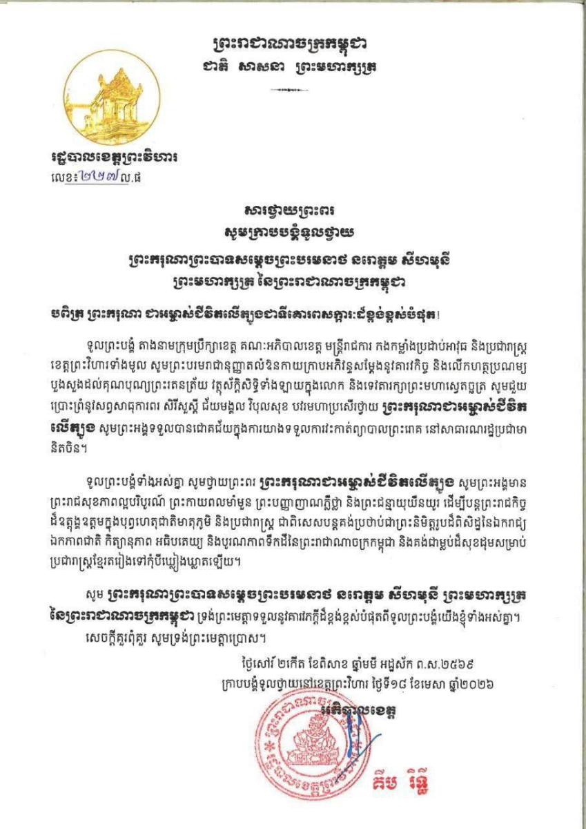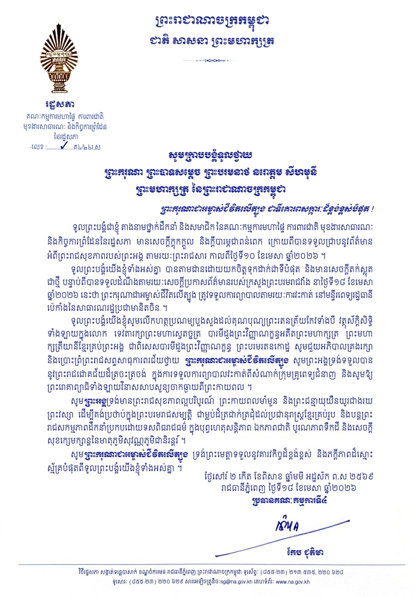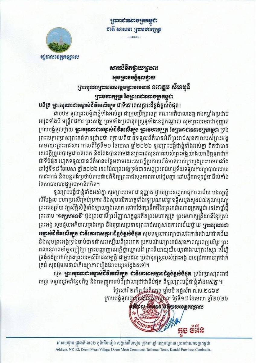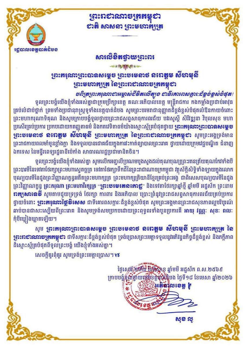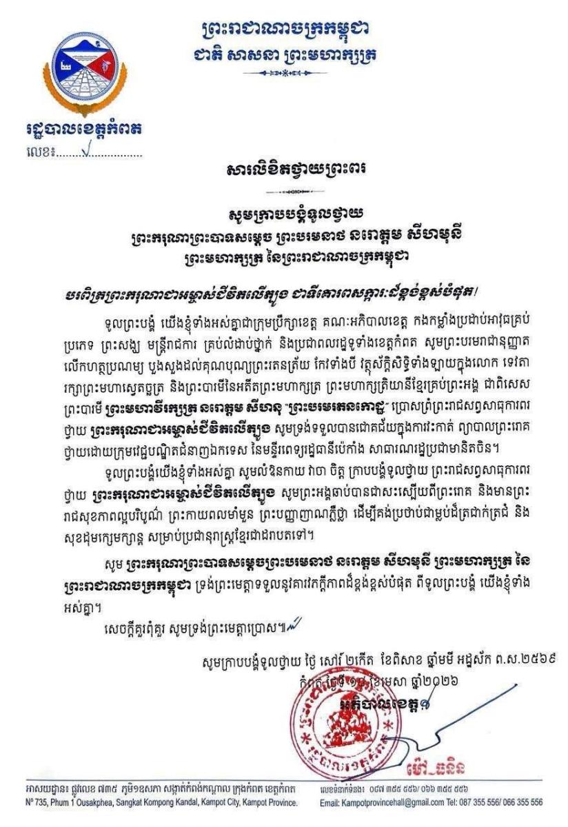 បណ្ដាក្រសួង ស្ថាប័ន មន្ត្រីរាជការគ្រប់ជាន់ថ្នាក់ និងកងកម្លាំងប្រដាប់អាវុធគ្រប់ប្រភេទ ព្រម​ទាំង​ប្រជានុរាស្ត្រទូទាំងព្រះរាជាណាចក្រកម្ពុជា, បានសម្តែងនូវក្តីព្រួយបារម្ភ ក្រោយ​ពី​ទទួល​បាន​ព័ត៌មា​នថា ព្រះរោគមហារីកក្រពេញប្រូស្អាត (Prostate Cancer) របស់ព្រះ​ករុណា​ជា​អម្ចាស់​ជីវិត​លើ​ត្បូង ជាទីគោរពសក្ការៈដ៏ខ្ពង់ខ្ពស់បំផុត តម្រូវឱ្យ ព្រះអង្គ ទទួលការព្យាបាល​ដោយ​ការ​វះ​កាត់​តាម​វេជ្ជបញ្ជានៅក្នុង មន្ទីរពេទ្យនារដ្ឋធានីប៉េកាំង នៃសាធារណរដ្ឋប្រជាមានិតចិន និង​បន្ត​គង់​ប្រថាប់​នៅទីនោះមួយរយៈពេល ដើម្បី តាមដាន ត្រួតពិនិត្យ និងព្យាបាលព្រះរោគ ចាប់​ពី​ថ្ងៃ​ទី​១៨ ​ខែមេសា ឆ្នាំ២០២៦ តទៅ។