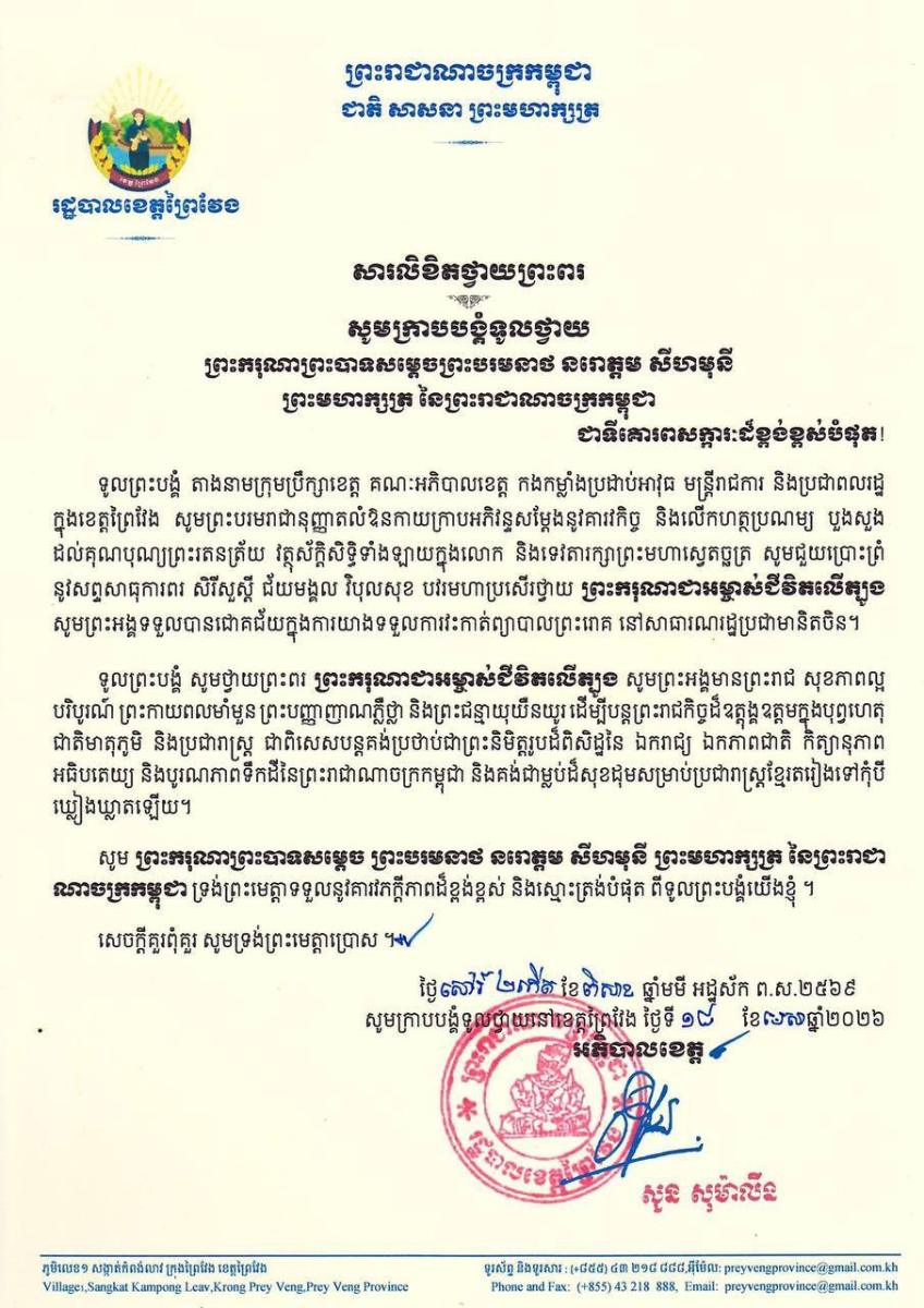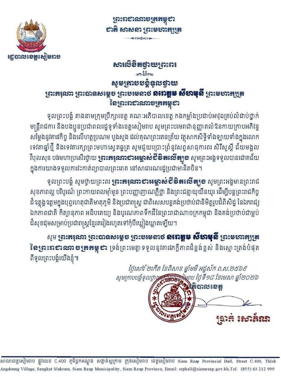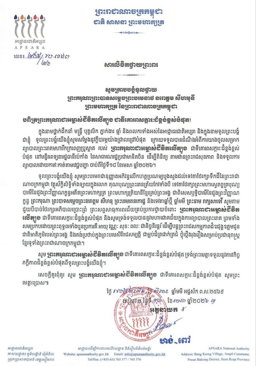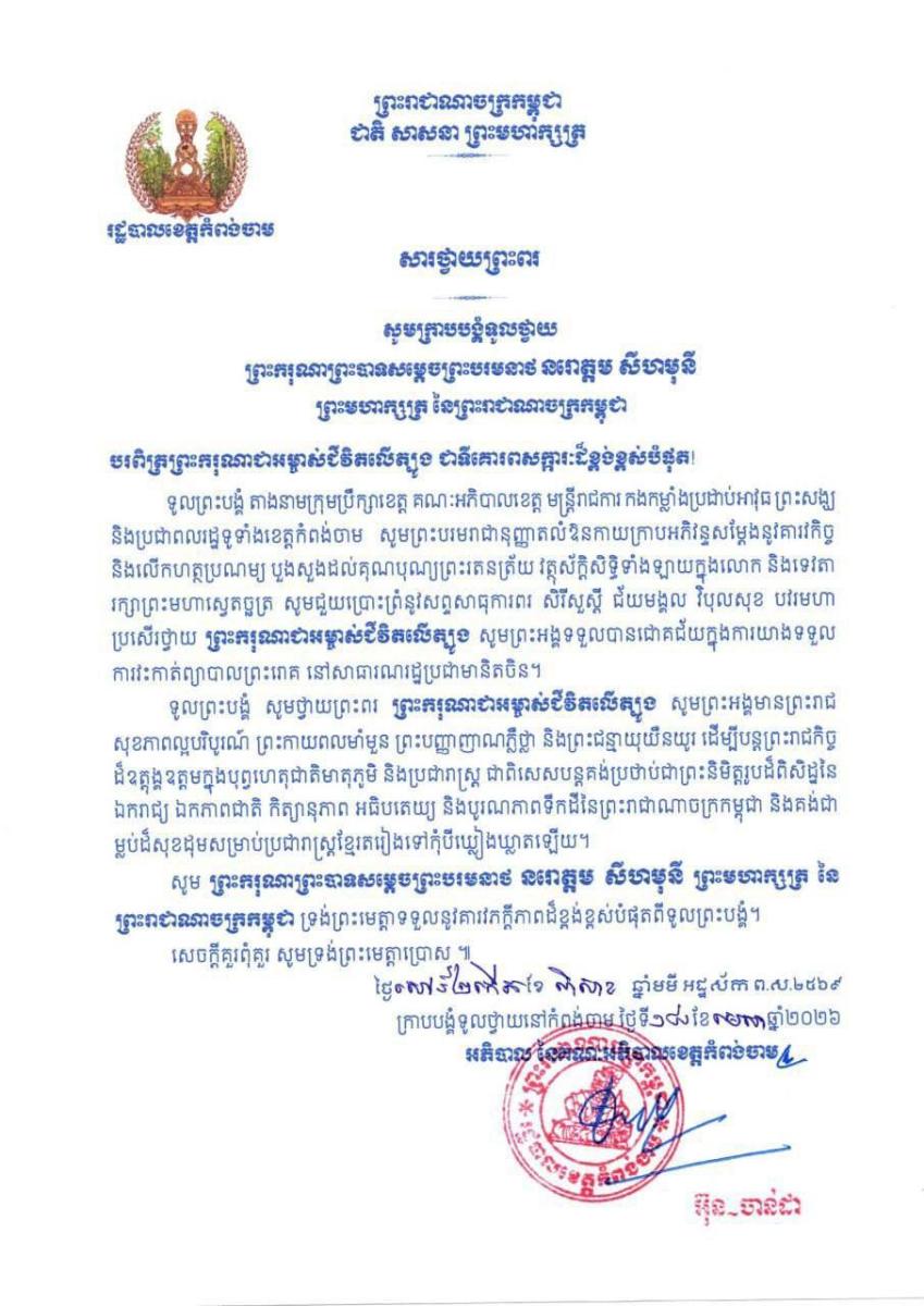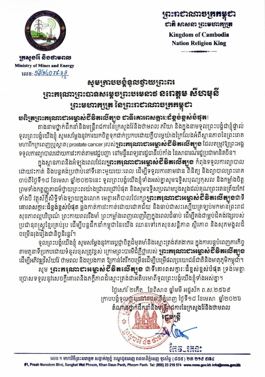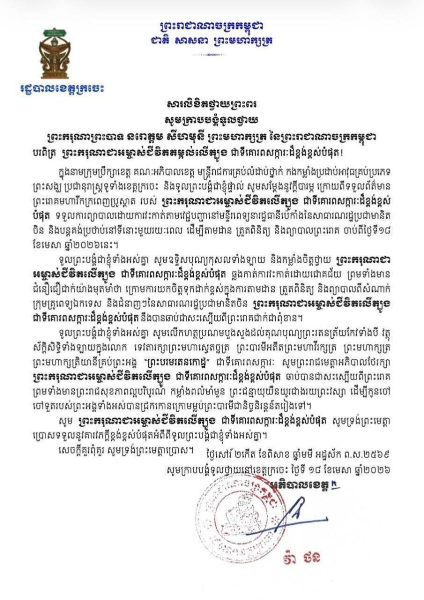 បណ្ដាក្រសួង ស្ថាប័ន មន្ត្រីរាជការគ្រប់ជាន់ថ្នាក់ និងកងកម្លាំងប្រដាប់អាវុធគ្រប់ប្រភេទ ព្រម​ទាំង​ប្រជានុរាស្ត្រទូទាំងព្រះរាជាណាចក្រកម្ពុជា, បានសម្តែងនូវក្តីព្រួយបារម្ភ ក្រោយ​ពី​ទទួល​បាន​ព័ត៌មា​នថា ព្រះរោគមហារីកក្រពេញប្រូស្អាត (Prostate Cancer) របស់ព្រះ​ករុណា​ជា​អម្ចាស់​ជីវិត​លើ​ត្បូង ជាទីគោរពសក្ការៈដ៏ខ្ពង់ខ្ពស់បំផុត តម្រូវឱ្យ ព្រះអង្គ ទទួលការព្យាបាល​ដោយ​ការ​វះ​កាត់​តាម​វេជ្ជបញ្ជានៅក្នុង មន្ទីរពេទ្យនារដ្ឋធានីប៉េកាំង នៃសាធារណរដ្ឋប្រជាមានិតចិន និង​បន្ត​គង់​ប្រថាប់​នៅទីនោះមួយរយៈពេល ដើម្បី តាមដាន ត្រួតពិនិត្យ និងព្យាបាលព្រះរោគ ចាប់​ពី​ថ្ងៃ​ទី​១៨ ​ខែមេសា ឆ្នាំ២០២៦ តទៅ។