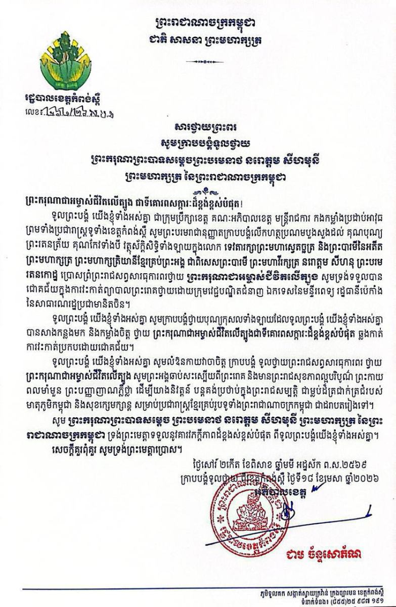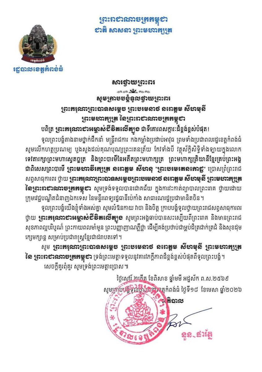 បណ្ដាក្រសួង ស្ថាប័ន មន្ត្រីរាជការគ្រប់ជាន់ថ្នាក់ និងកងកម្លាំងប្រដាប់អាវុធគ្រប់ប្រភេទ ព្រម​ទាំង​ប្រជានុរាស្ត្រទូទាំងព្រះរាជាណាចក្រកម្ពុជា សូម​លើក​ហត្ថ​ប្រណម្យ​បួង​សួង​ដល់​វត្ថុ​ស័ក្តិ​សិទ្ធិ​ទាំង​ឡាយ​ក្នុងលោកគុណបុណ្យព្រះរតនត្រ័យកែវទាំងបី ទេវតាថែរក្សាព្រះមហាស្វេតច្ឆត្រ ព្រះ​បារមី​នៃ​អតីត​ព្រះមហាក្សត្រ ព្រះមហាក្សត្រយានីខ្មែរគ្រប់ព្រះអង្គ ជាទីគោរពសក្ការៈ សូម​ព្រះរាជ​មេត្តា​អភិបាល​ថែ​រក្សា ព្រះករុណាជា អម្ចាស់ជីវិតលើត្បូង ជាទីគោរពសក្ការៈដ៏ខ្ពង់ខ្ពស់បំផុត ឆាប់​បាន​ជា​សះ​ស្បើ​យពីព្រះរោគ និង មាន ព្រះរាជសុខភាពល្អបរិបូណ៌ ព្រះពលានុភាពរឹងមាំខ្លាំងក្លា ឡើង​វិញ ​ដើម្បីយាងនិវត្តន៍បន្តគង់ប្រថាប់ក្នុងព្រះបរម រាជសម្បត្តិ ជាម្លប់ដ៏ត្រជាក់ត្រជំថ្កុំថ្កើង របស់​មាតុ​ភូមិ​កម្ពុជា និងប្រជានុរាស្ត្រខ្មែរគ្រប់រូប របស់ព្រះអង្គ ជាអង្វែង តរៀងទៅ៕