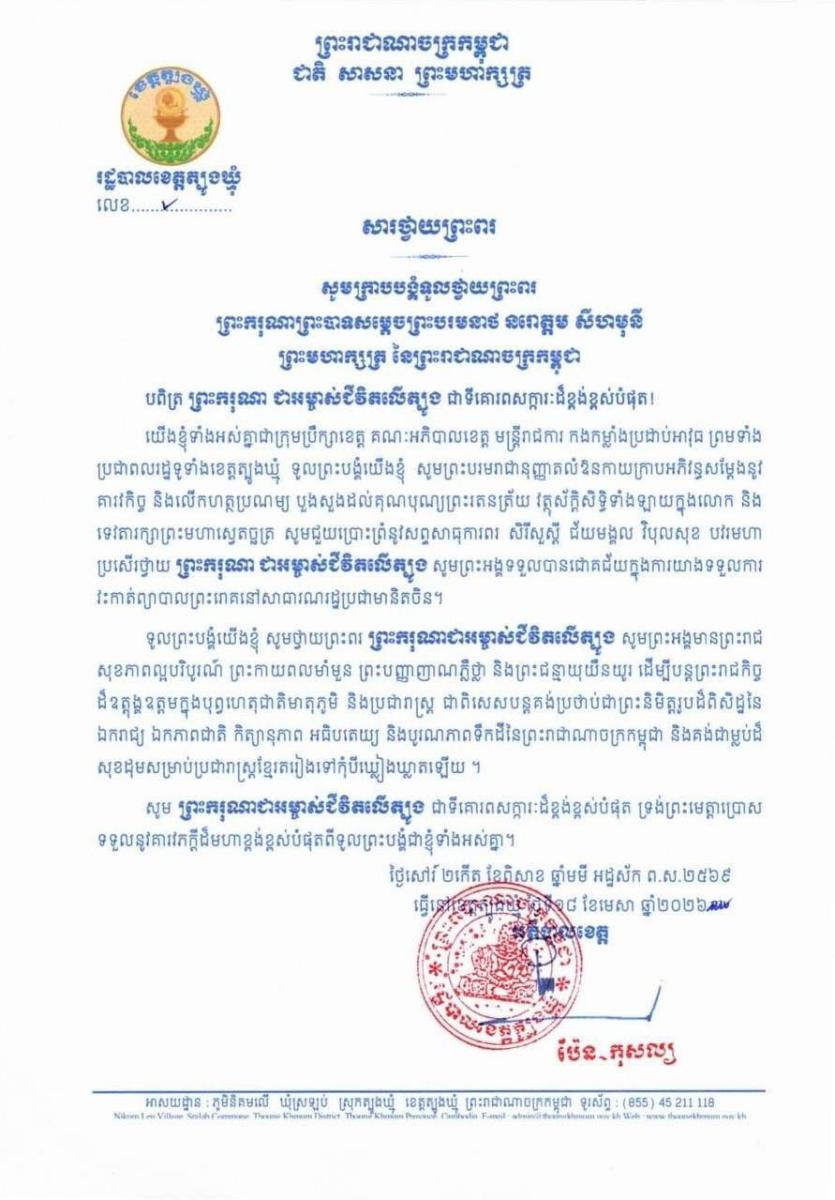 បណ្ដាក្រសួង ស្ថាប័ន និងមន្រ្ដីរាជការគ្រប់ជាន់ថ្នាក់ ក៏ដូចជាប្រជាពលរដ្ឋទូទាំងប្រទេស ក្រាប​បង្គំ​ថ្វាយ​ព្រះព​រចំពោះព្រះករុណាព្រះបាទសម្តេចព្រះបរមនាថ នរោត្តម សីហមុនី ព្រះមហាក្សត្រ នៃ​ព្រះរាជាណាចក្រកម្ពុជាឆាប់បានជាសះស្បើយពីព្រះរោគព្រមទាំងមានព្រះរាជសុខភាពល្អ បរិបូរ កម្លាំងពលំមាំមួន ដើម្បីយាងនិវត្តន៍ បន្តគង់​ប្រថាប់ក្នុ​ង​ព្រះបរមរាជ​សម្បត្តិ​ជា​ម្លប់​ដ៏​ត្រជាក់​ត្រជំ​របស់មា​តុភូមិកម្ពុជា និងប្រជានុរាស្ត្រខ្មែរ​គ្រប់​រូប​នៅ​ទូទាំង​ព្រះរាជា​ណា​ចក្រ​កម្ពុជា​ជាដរាបត​រៀងទៅ។