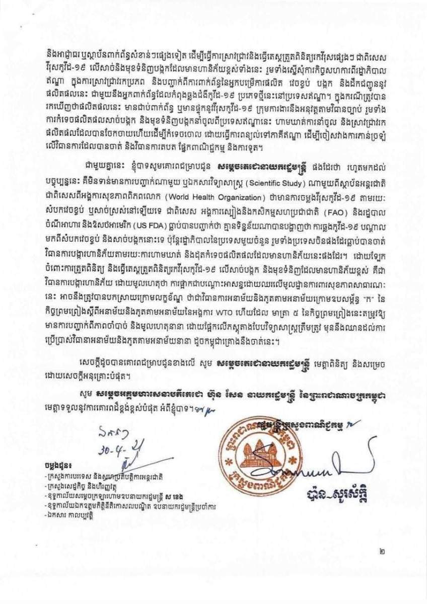 ក្នុងលិខិតផ្ញើជូនទៅសម្ដេចតេជោ ហ៊ុន សែន កាលពីថ្ងៃម្សិលមិញនេះ រដ្ឋមន្ត្រីក្រសួងពាណិជ្ជកម្ម ឯកឧត្ដម ប៉ាន់ សូរស័ក្តិ បានស្នើសុំគោលការណ៍សម្រេចលើការឃាត់ទុកទំនិញដែលនាំចូលប្រទេសកម្ពុជា និងផ្អាកនាំចូលជាបណ្ដោះអាសន្ននូវការនាំចូលសាច់បង្កក និងមុខទំនិញបង្កកដែលនាំចូលមកពីប្រទេសឥណ្ឌា។