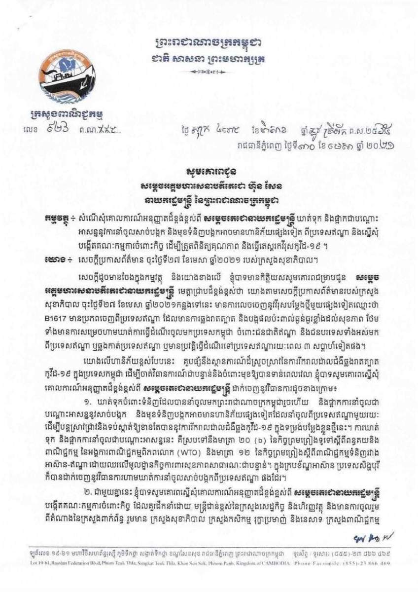 ក្រសួងពាណិជ្ជកម្មបានស្នើសុំគោលការណ៍បែបនេះពីសម្ដេចតេជោ ហ៊ុន សែន បន្ទាប់ពីកម្ពុជាបានសម្រេចហាមឃាត់អ្នកដំណើរទាំងអស់ធ្វើដំណើរមកពី ឬឆ្លងកាត់ប្រទេសឥណ្ឌា មិនឱ្យចូលប្រទេសកម្ពុជាជាបណ្ដោះអាសន្នសិន ដោយសារតែការឆ្លងរីករាលដាលនៃមេរោគកូវីដ-១៩ទម្រង់ថ្មី B1617 កំពុងផ្ទុះឡើងខ្លាំងនៅក្នុងប្រទេសឥណ្ឌា។