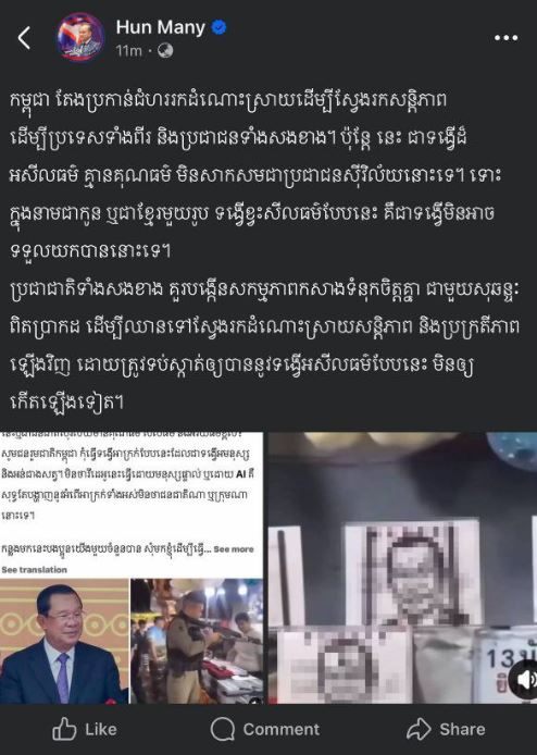តាមរយៈបណ្ដាញសង្គមនៅថ្ងៃទី៦ខែតុលានេះ ឯកឧត្ដម ហ៊ុន ម៉ានី បានសរសេរថា «កម្ពុជាតែងប្រកាន់ជំហររកដំណោះស្រាយដើម្បីស្វែងរកសន្តិភាព ដើម្បីប្រទេសទាំងពីរ និងប្រជាជនទាំងសងខាង។ ប៉ុន្តែនេះ ជាទង្វើដ៏អសីលធម៌ គ្មានគុណធម៌ មិនសាកសមជាប្រជាជនស៊ីវិល័យនោះទេ។ ទោះក្នុងនាមជាកូន ឬជាខ្មែរមួយរូប ទង្វើខ្វះសីលធម៌បែបនេះ គឺជាទង្វើមិនអាចទទួលយកបាននោះទេ។»