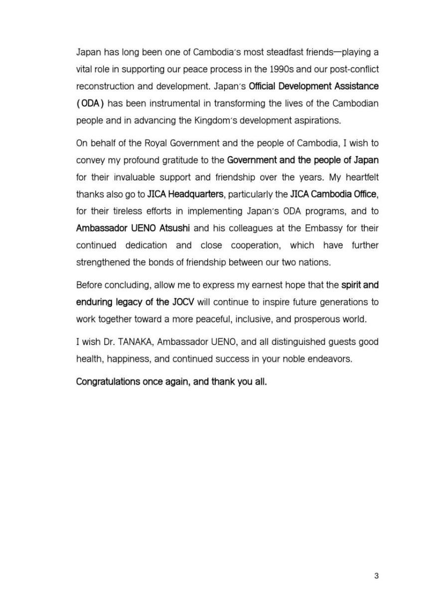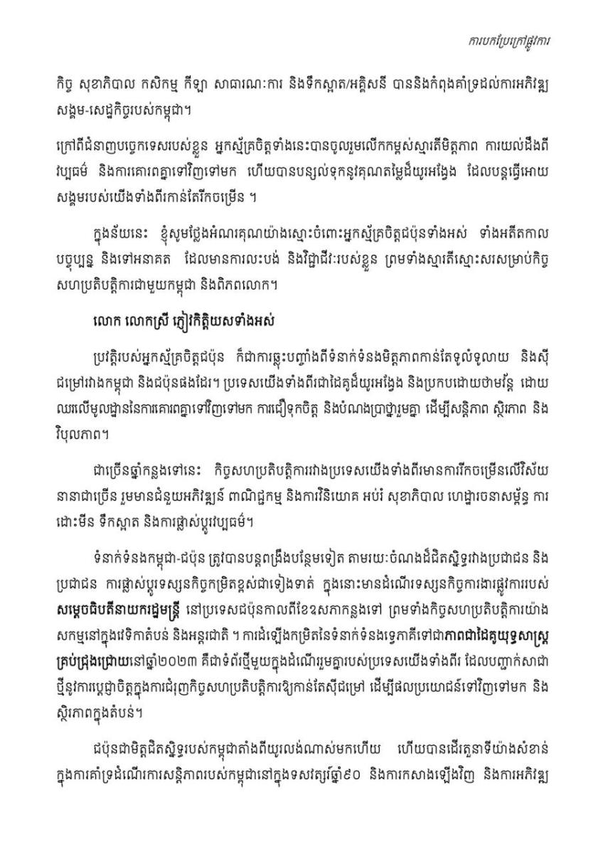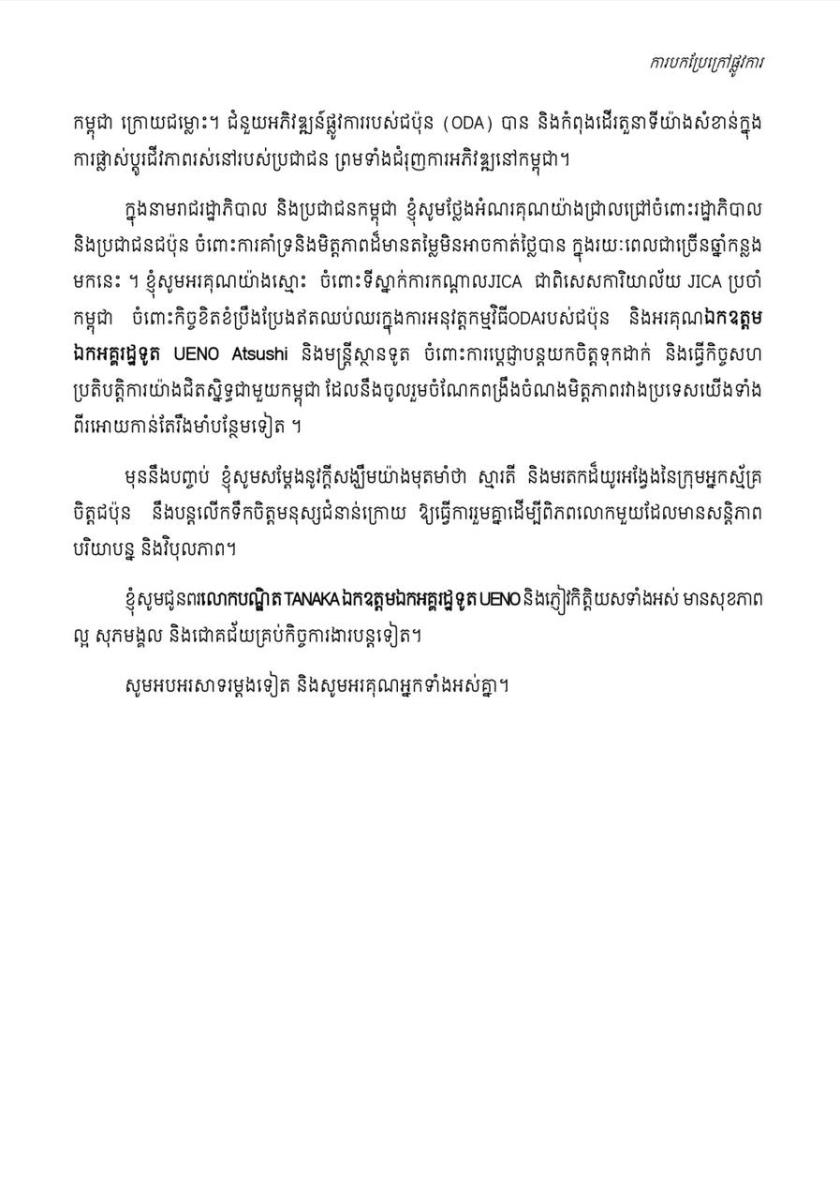 ក្នុងនាមរាជរដ្ឋាភិបាល និងប្រជាជនកម្ពុជា ឯកឧត្តម ប្រាក់ សុខុន សូមថ្លែងអំណរគុណយ៉ាងជ្រាលជ្រៅចំពោះរដ្ឋាភិបាល និងប្រជាជនជប៉ុន ចំពោះការគាំទ្រនិងមិត្តភាពដ៏មានតម្លៃមិនអាចកាត់ថ្លៃបាន ក្នុងរយៈពេលជាច្រើនឆ្នាំកន្លង មកនេះ។ សូមអរគុណយ៉ាងស្មោះ ចំពោះទីស្នាក់ការកណ្តាលJICA ជាពិសេសការិយាល័យ JICA ប្រចាំ កម្ពុជា ចំពោះកិច្ចខិតខំប្រឹងប្រែងឥតឈប់ឈរក្នុងការអនុវត្តកម្មវិធី ODA របស់ជប៉ុន និងអរគុណឯកឧត្តម ឯកអគ្គរដ្ឋទូត UENO Atsushi និងមន្ត្រីស្ថានទូត ចំពោះការប្តេជ្ញាបន្តយកចិត្តទុកដាក់ និងធ្វើកិច្ចសហ ប្រតិបត្តិការយ៉ាងជិតស្និទ្ធជាមួយកម្ពុជា ដែលនឹងចូលរួមចំណែកពង្រឹងចំណងមិត្តភាពរវាងប្រទេសយើងទាំង ពីរអោយកាន់តែរឹងមាំបន្ថែមទៀត។