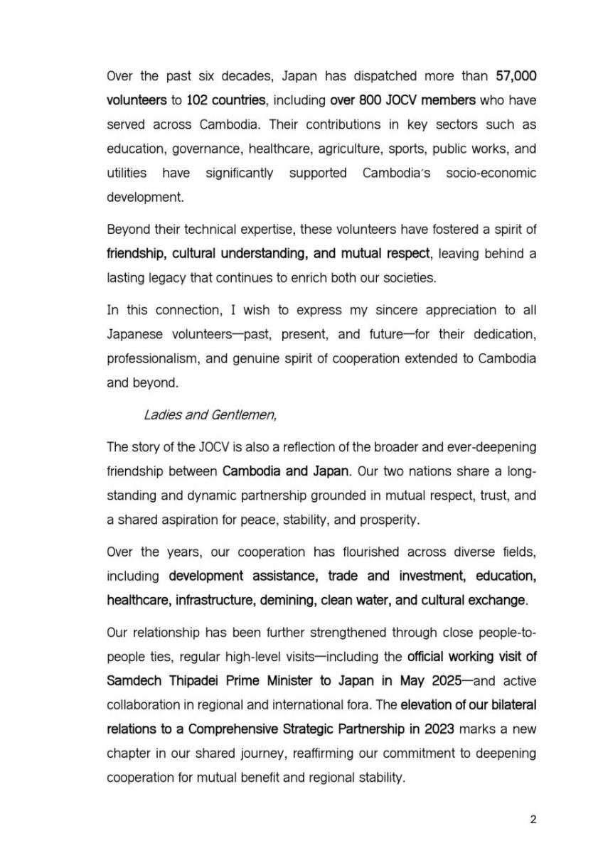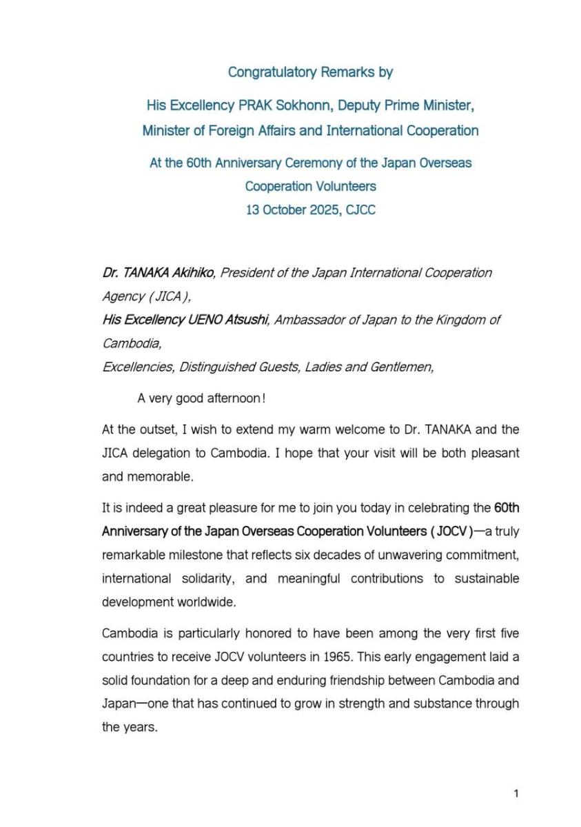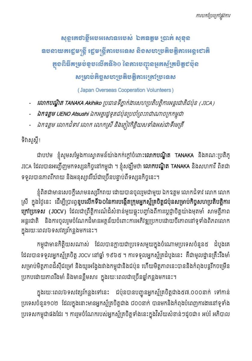 តាមរយៈ សុន្ទរកថាខ្លីអបអរសាទរ ក្នុងពិធីគម្រប់ខួបលើកទី៦០ នៃការបញ្ជូនអ្នកស្ម័គ្រចិត្តជប៉ុន សម្រាប់កិច្ចសហប្រតិបត្តិការក្រៅប្រទេស (Japan Overseas Cooperation Volunteers) ឯកឧត្តម ប្រាក់ សុខុន បានលើកឡើងថា ប្រវត្តិរបស់អ្នកស្ម័គ្រចិត្តជប៉ុន ក៏ជាការឆ្លុះបញ្ចាំងពីទំនាក់ទំនងមិត្តភាពកាន់តែទូលំទូលាយ និងស៊ីជម្រៅរវាងកម្ពុជា និងជប៉ុនផងដែរ។ ប្រទេសទាំងពីរជាដៃគូដ៏យូរអង្វែង និងប្រកបដោយថាមវន្ត ដោយ ឈរលើមូលដ្ឋាននៃការគោរពគ្នាទៅវិញទៅមក ការជឿទុកចិត្ត និងបំណងប្រាថ្នារួមគ្នា ដើម្បីសន្តិភាព ស្ថិរភាព និងវិបុលភាព។ ជាច្រើនឆ្នាំកន្លងទៅនេះ កិច្ចសហប្រតិបត្តិការរវាងប្រទេសយើងទាំងពីរមានការរីកចម្រើនលើវិស័យនានាជាច្រើន រួមមានជំនួយអភិវឌ្ឍន៍ ពាណិជ្ជកម្ម និងការវិនិយោគ អប់រំ សុខាភិបាល ហេដ្ឋារចនាសម្ព័ន្ធ ការ ដោះមីន ទឹកស្អាត និងការផ្លាស់ប្តូរវប្បធម៌។