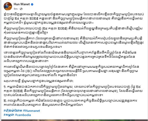 សម្ដេចនាយករដ្ឋមន្រ្ដីបានថ្លែងថា សម្ដេចបានឃើញនូវការអត្ថាធិប្បាយមួយចំនួនតាមបណ្តាញសង្គម ដែលបានលើកឡើងថាកិច្ចព្រមព្រៀងបទឈប់បាញ់ថ្ងៃ ២៨ កក្កដា ២០២៥ កន្លងទៅ និងកិច្ចព្រមព្រៀងសន្តិភាពនាពេលខាងមុខ គឺជាថ្នូរនឹងការធ្វើអោយកម្ពុជាបាត់ដី។