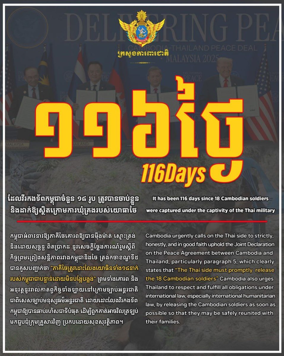 យោងតាមឆាណែលតេលេក្រាម និងផេកហ្វេសបុករបស់ក្រសួងការពារជាតិកម្ពុជា បានលើកឡើងថា ថ្ងៃនេះជាថ្ងៃទី១១៦ហើយ ដែលវីរកងទ័ពកម្ពុជាចំនួន១៨រូប ត្រូវបានចាប់ខ្លួន និងដាក់ឱ្យស្ថិតក្រោមការឃុំគ្រងរបស់យោធាថៃ។ ក្រសួងការពារជាតិកម្ពុជា បានបញ្ជាក់ថា«រាជរដ្ឋាភិបាលកម្ពុជា បាននឹងកំពុងធ្វើការយ៉ាងសស្រាក់សស្រាំឥតឈប់ឈរដោយបានប្រើប្រាស់គ្រប់មធ្យោបាយ និងយន្តការដោះស្រាយទាំងអស់ ដើម្បីទាមទារឱ្យភាគីថៃដោះលែងវីរកងទ័ពរបស់យើងទាំង១៨នាក់នោះ ឱ្យបានឆាប់រហ័សជាទីបំផុត និងដោយសុខសុវត្ថិភាព»។