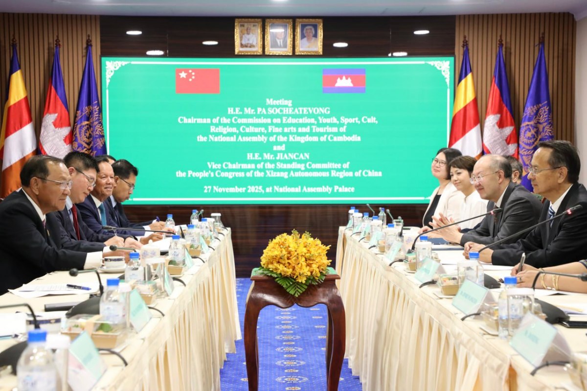 ឯកឧត្តម ប៉ា សុជាតិវង្ស ប្រធានគណៈកម្មការអប់រំ យុវជន កីឡា ធម្មការសាសនា វប្បធម៌ វិចិត្រសិល្បៈ និងទេសចរណ៍ (គណៈកម្មការទី៧)នៃរដ្ឋសភា បានជួបពិភាក្សាការងារជាមួយ ឯកឧត្តម ជៀន ឆាន (JIANCAN) អនុប្រធានគណៈកម្មាធិការអចិន្ត្រៃយ៍ នៃសភាតំណាងប្រជាជនចិនតំបន់ស្វយ័តស៊ីចាង (Xizang) នៃសាធារណរដ្ឋប្រជាមានិតចិន នាព្រឹកថ្ងៃទី២៧ ខែវិច្ឆិកា ឆ្នាំ២០២៥ នៅវិមានរដ្ឋសភា។