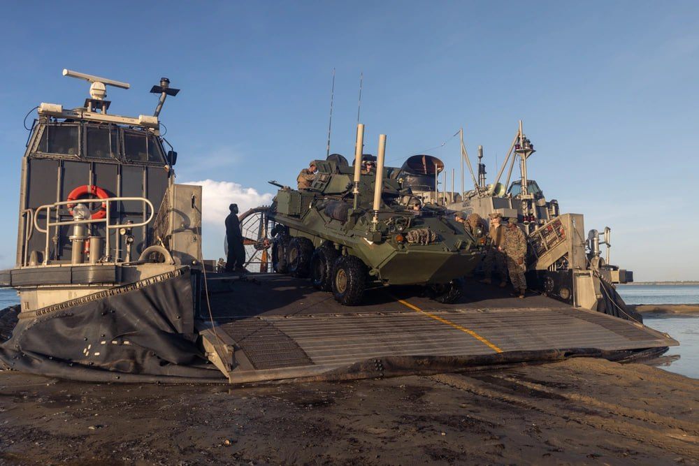 វីដេអូ បានបង្ហាញពីនាវាចូលចតរបស់កងទ័ពជើងទឹកកំពុងខិតជិតឆ្នេរ មុនពេលយានធ្វើប្រតិបតិត្តិការទាំងលើគោកនិងក្នុងទឹក រថយន្តHumvees និងយុទ្ធោបករណ៍ធុនធ្ងន់បើកឡើងលើវាលខ្សាច់។