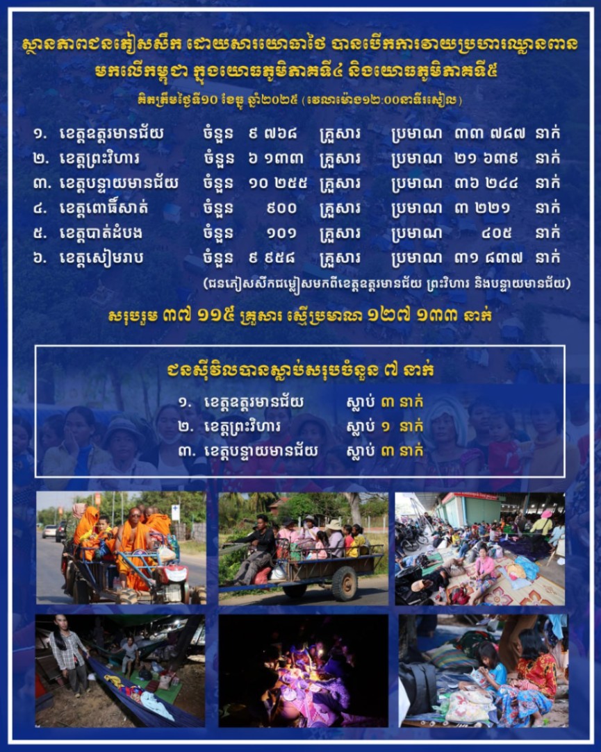 មកដល់រសៀលថ្ងៃទី១០ ខែធ្នូ ឆ្នាំ២០២៥នេះ កម្ពុជាមានជនស៊ីវិលបានស្លាប់បាត់បង់ជីវិតចំនួន ៧នាក់ រងរបួស ២០នាក់ និងមានជនភៀសសឹកបានកើនឡើងដល់ជាង ៣ម៉ឺន៧ពាន់គ្រួសារ សរុបប្រជាពលរដ្ឋ មានជាង១២ម៉ឺននាក់ ដោយសារការឈ្លានពានរបស់យោធាថៃមកលើដែនអធិបតេយ្យភាពរបស់កម្ពុជា។ នេះបើយោងតាមរបាយការណ៍របស់ក្រសួងការពារជាតិកម្ពុជានារសៀលនេះ។