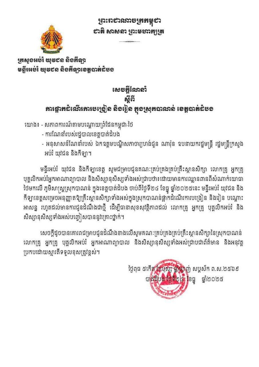 នៅថ្ងៃទី២៤ ខែធ្នូ ឆ្នាំ២០២៥ នេះ មន្ទីរអប់រំ យុវជន និងកីឡាខេត្តបាត់ដំបង បានចេញ សេចក្តីណែនាំ ស្តីពី ការផ្អាកដំណើរការបង្រៀន និងរៀន ក្នុងស្រុកបាណន់ ខេត្តបាត់ដំបង ជាបណ្ដោះអាសន្ន។