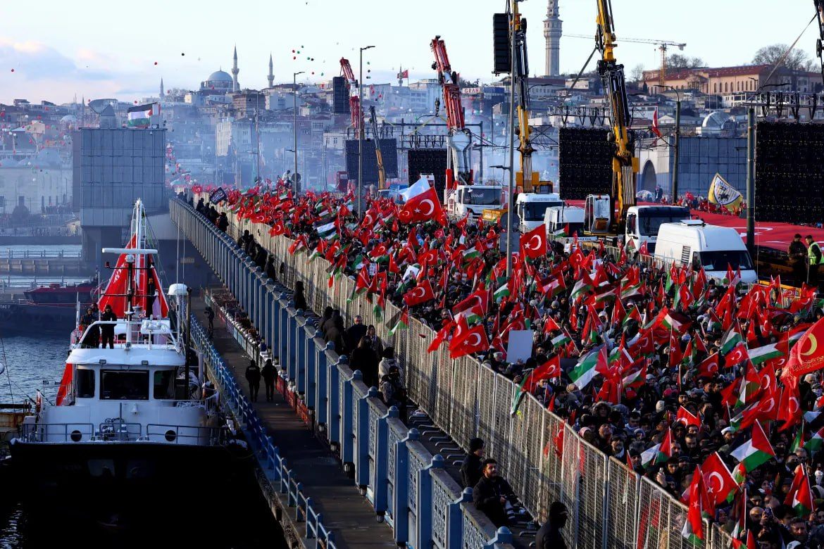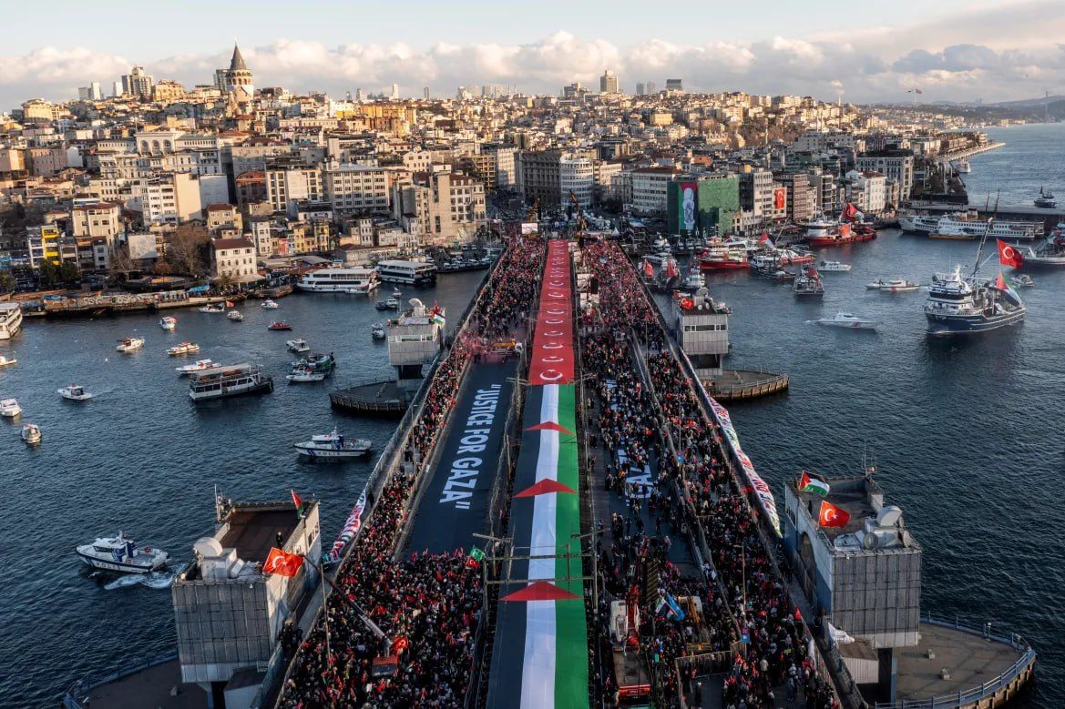 មនុស្សប្រហែល ៥២ម៉ឺននាក់ បានប្រមូលផ្តុំគ្នានៅព្រឹកថ្ងៃចូលឆ្នាំថ្មីគឺថ្ងៃព្រហស្បតិ៍ ទី១ ខែមករា ឆ្នាំ២០២៦ នេះ នៅឯស្ពាន Galata ក្នុងទីក្រុងអ៊ីស្តង់ប៊ុល ប្រទេសទួរគី សម្រាប់ការដើរដង្ហែក្បួនដ៏ធំមួយដើម្បីគាំទ្រប្រជាជនប៉ាឡេស្ទីន ដែលរៀបចំឡើងក្រោមឆ័ត្រសម្ព័ន្ធមនុស្សធម៌ និងវេទិកាឆន្ទៈជាតិ។