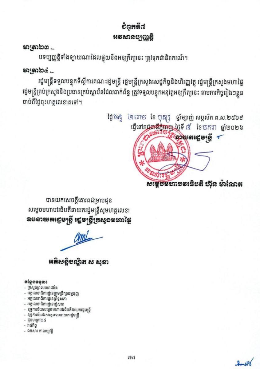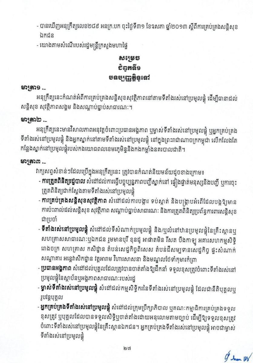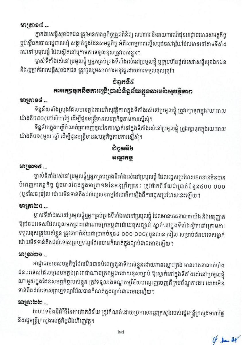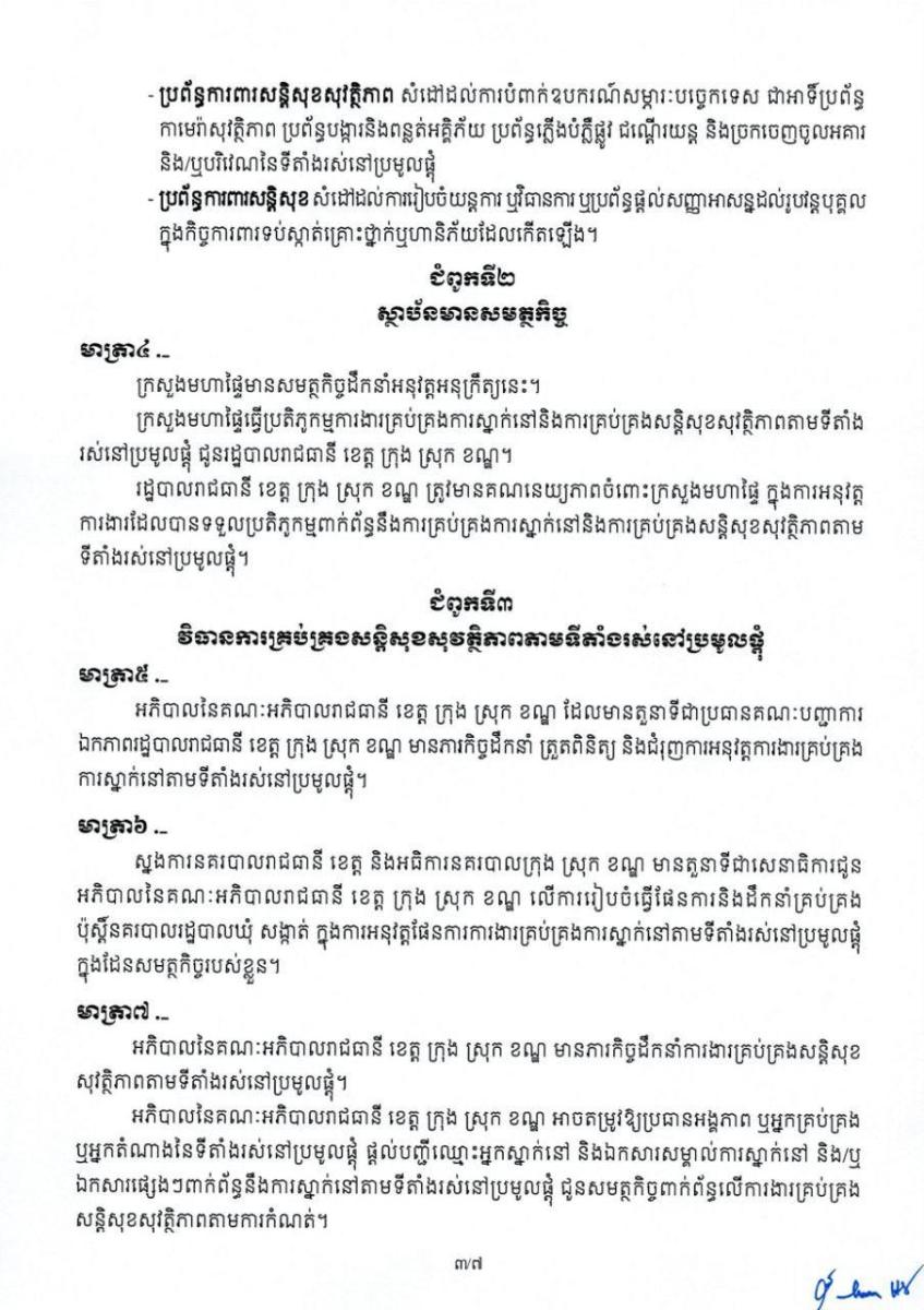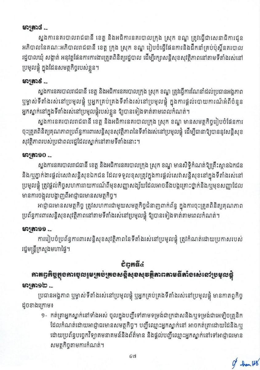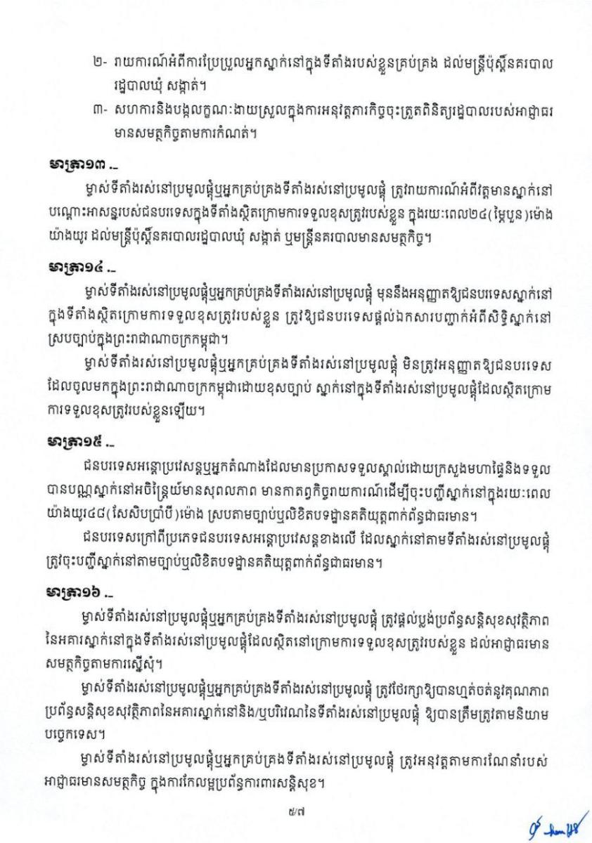 តាមរយៈអនុក្រឹត្យនេះដែរ សម្តេចធិបតី នាយករដ្ឋមន្រ្តីនៃកម្ពុជា ក៏បានបញ្ជាឲ្យអភិបាលនៃគណៈអភិបាលរាជធានី ខេត្ត ក្រុង ស្រុក និងខណ្ឌ ដែលមានតួនាទីជាប្រធានគណៈបញ្ជាការឯកភាពរដ្ឋបាល មានភារកិច្ចដឹកនាំ ត្រួតពិនិត្យ និងជំរុញការអនុវត្តការងារគ្រប់គ្រងការស្នាក់នៅតាមទីតាំងរស់នៅប្រមូលផ្តុំផងដែរ ហើយស្នងការនគរបាលរាជធានី-ខេត្ត អធិការក្រុង ស្រុក និងខណ្ឌ ត្រូវធ្វើការណែនាំដល់ប្រ ធានអង្គភាពឬម្ចាស់ទីតាំងរស់នៅប្រមូលផ្តុំ ឬអ្នកគ្រប់គ្រងទីតាំងរស់នៅប្រមូលផ្តុំ ក្នុងការផ្តល់របាយការណ៍អំពីចំនួនអ្នកស្នាក់នៅក្នុងទីតាំងរស់នៅប្រមូលផ្តុំរបស់ខ្លួន ឲ្យបានទៀងទាត់តាមពេលកំណត់ផងដែរ៕