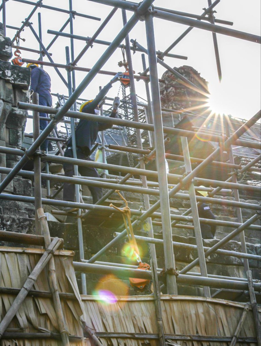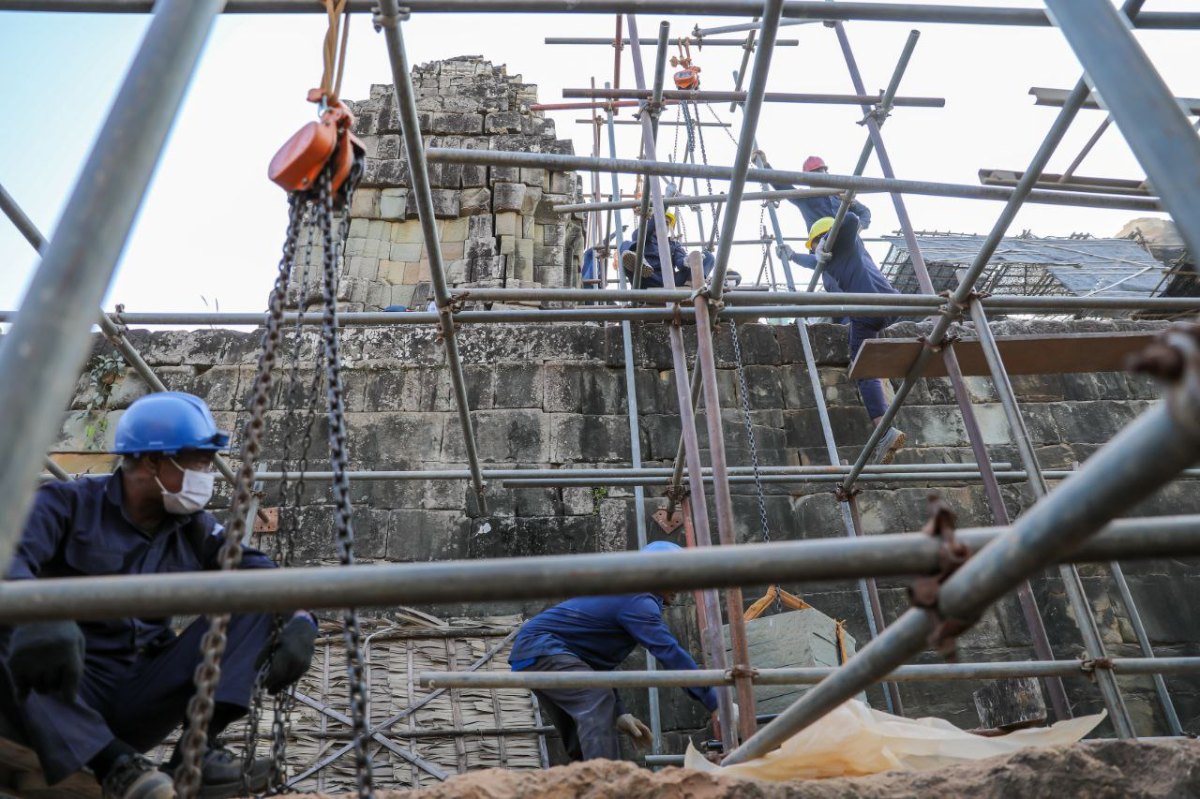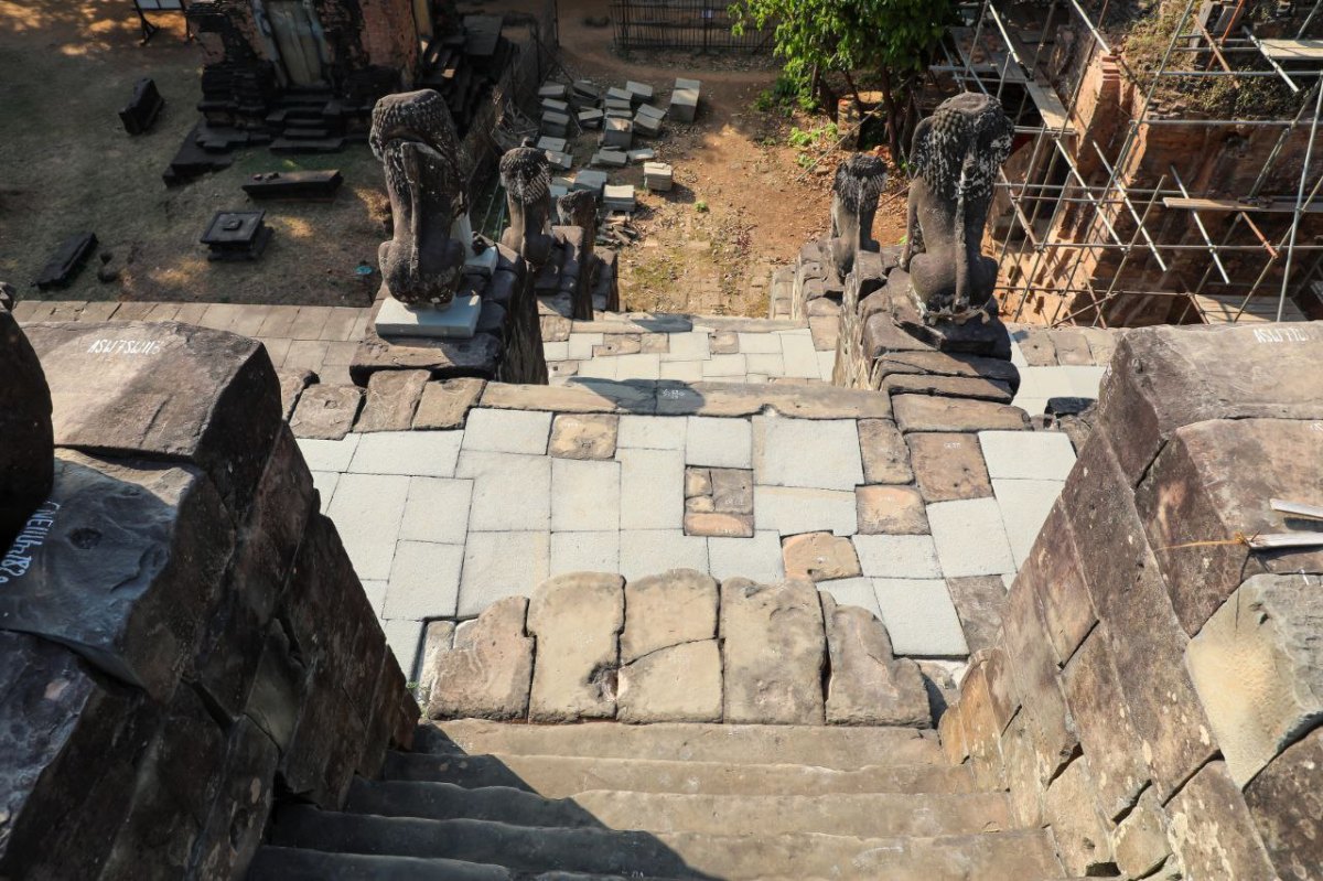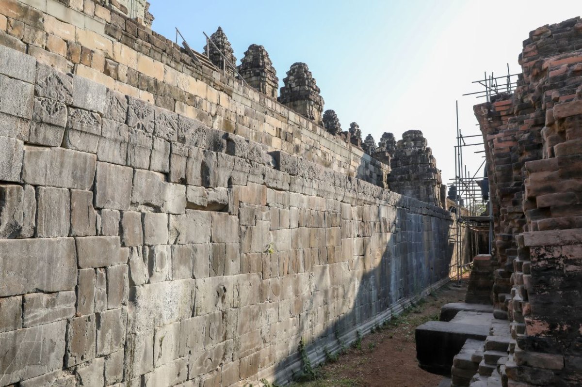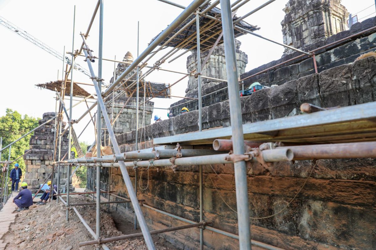 ចំពោះស្ថានភាពការខូចខាតនៅជ្រុងខាងលិច អ្នកជំនាញពន្យល់ថា មានការស្រុតគ្រឹះ ថ្មងាកចេញពីគ្នា និងមានការដួលរលុះថ្មនៅផ្នែកជញ្ជាំង និងចម្លាក់តោ។ ក្រៅពីជួសជុលពង្រឹងឡើងវិញ ក្រុមការងារក៏បានពង្រឹងថ្មភ្នំដែលខ្លះបានប្រេះ និងមានការពុកផុយ ដោយប្រើបច្ចេកទេសមួយចំនួនដើម្បីឱ្យវារឹងមាំឡើងវិញ។