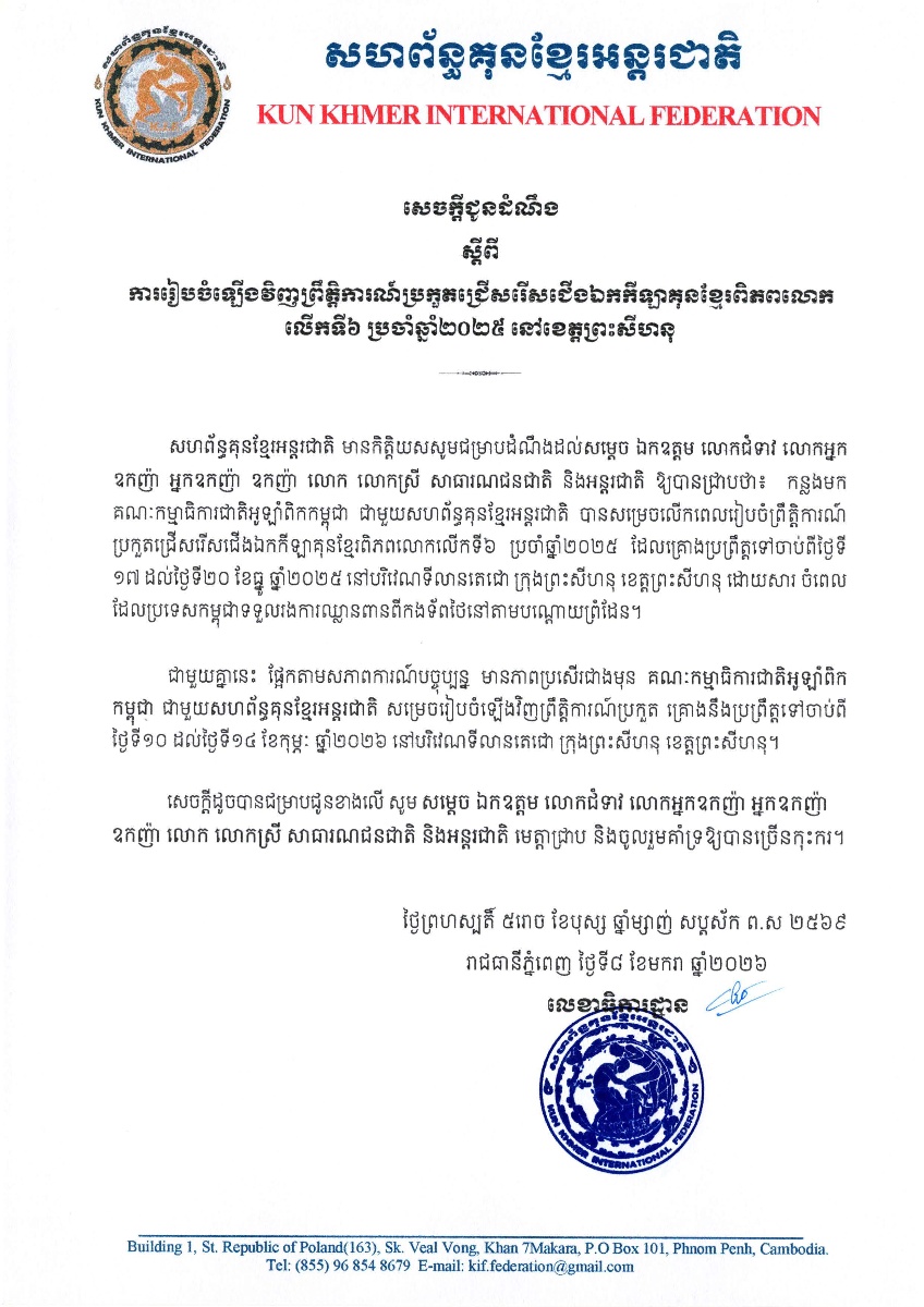 សហព័ន្ធគុនខ្មែរអន្ដរជាតិ បានប្រកាសកាលបរិច្ឆេទថ្មី ដែលត្រូវរៀបចំព្រឹត្តិការណ៍ប្រកួតកីឡាប្រដាល់គុនខ្មែរជើងឯកពិភពលោក លើកទី៦ ឆ្នាំ២០២៥ ដែលនឹងប្រព្រឹត្តទៅ ចាប់ពីថ្ងៃទី១០ ដល់ថ្ងៃទី១៤ ខែកុម្ភៈ ឆ្នាំ២០២៦ ខាងមុខ នៅបរិវេណទីលានតេជោ ក្រុងព្រះសីហនុ ខេត្តព្រះសីហនុ។