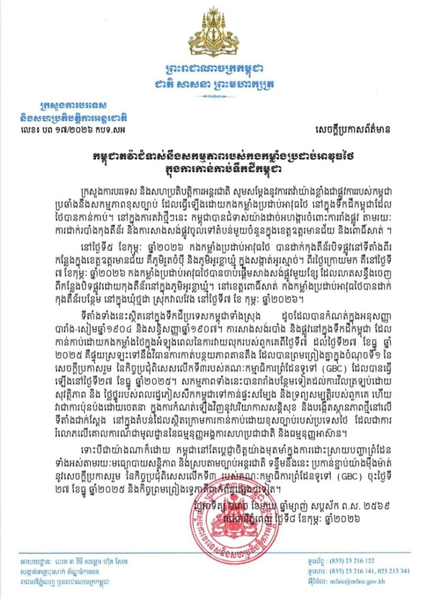 ក្រសួងការបរទេសកម្ពុជាបានបញ្ជាក់ថា ទីតាំងទាំងនេះស្ថិតនៅក្នុងទឹកដីប្រទេសកម្ពុជាទាំងស្រុង ដូចដែលបានកំណត់ក្នុងអនុសញ្ញា បារាំង-សៀមឆ្នាំ១៩០៤ និងសន្ធិសញ្ញាឆ្នាំ១៩០៧។ ការសាងសង់របាំង និងផ្លូវនៅក្នុងទឹកដីកម្ពុជា ដែល កាន់កាប់ដោយកងកម្លាំងថៃក្នុងអំឡុងពេលនៃការវាយលុករបស់ពួកគេពីថ្ងៃទី៧ ដល់ថ្ងៃទី២៧ ខែធ្នូ ឆ្នាំ ២០២៥ គឺផ្ទុយស្រឡះទៅនឹងវិធានការកាត់បន្ថយភាពតានតឹង ដែលបានព្រមព្រៀងគ្នាក្នុងចំណុចទី១ នៃ សេចក្តីប្រកាសរួម នៃកិច្ចប្រជុំពិសេសលើកទី៣របស់គណៈកម្មាធិការព្រំដែនទូទៅ (GBC) ដែលបានធ្វើ ឡើងនៅថ្ងៃទី២៧ ខែធ្នូ ឆ្នាំ២០២៥។ សកម្មភាពទាំងនេះបានរារាំងបន្ថែមទៀតដល់ការវិលត្រឡប់ដោយ សុវត្ថិភាព និង ថ្លៃថ្នូររបស់ពលរដ្ឋភៀសសឹកកម្ពុជាទៅកាន់ផ្ទះសម្បែង និងទ្រព្យសម្បត្តិរបស់ពួកគេ ហើយវាជាការប៉ុនប៉ងដោយចេតនា ក្នុងការកំណត់ឡើងវិញនូវបរិយាកាសសន្តិសុខ និងបង្កើតស្ថានភាពថ្មីនៅលើ ទីតាំងជាក់ស្តែង នៅក្នុងតំបន់ដែលស្ថិតក្រោមការកាន់កាប់ដោយខុសច្បាប់របស់ប្រទេសថៃ ដែលជាការ រំលោភលើគោលការណ៏ជាមូលដ្ឋាននៃធម្មនុញ្ញអង្គការសហប្រជាជាតិ និងធម្មនុញ្ញអាស៊ាន។