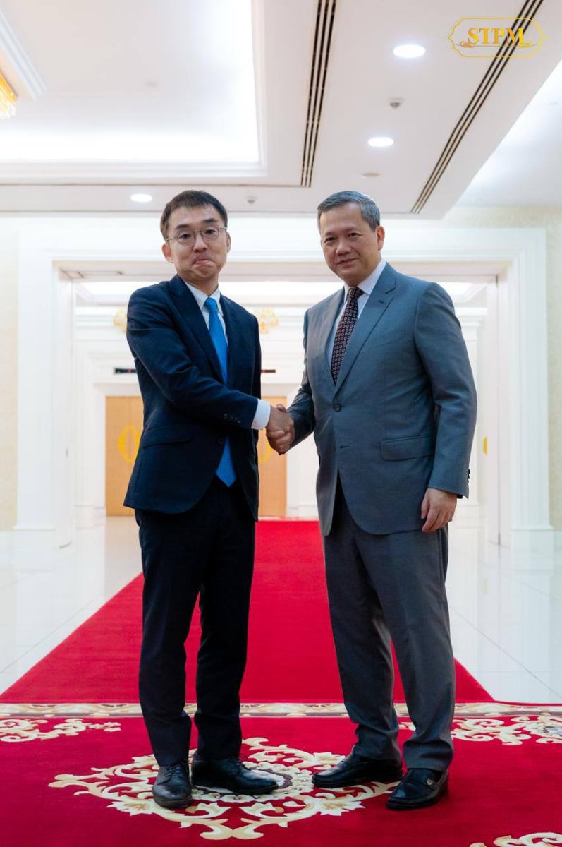 ព្រឹកថ្ងៃចន្ទ ទី៩ ខែកុម្ភៈ ឆ្នាំ២០២៦ សម្តេចមហាបវរធិបតី ហ៊ុន ម៉ាណែត នាយករដ្ឋមន្ត្រី នៃព្រះរាជាណាចក្រកម្ពុជា អញ្ជើញជួបជាមួយ លោក Tetsuya Watanabe ប្រធានវិទ្យាស្ថានស្រាវជ្រាវសេដ្ឋកិច្ចអាស៊ាន និងអាស៊ីបូព៌ា (Economic Research Institute for ASEAN and East Asia-ERIA) ក្នុងជំនួបសម្តែងការគួរសម និងពិភាក្សាការងារ នៅវិមានសន្តិភាព។