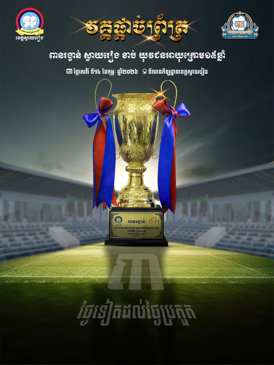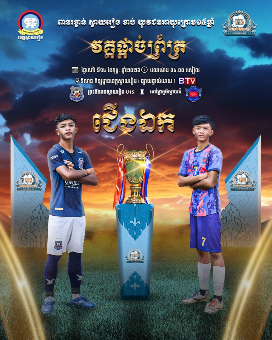 ក្រោយដំណើរការប្រកួតជាង ៤ខែ ពានរង្វាន់យុវជនអាយុក្រោម ១៥ឆ្នាំប្រចាំខេត្តស្វាយរៀង (Svay Rieng Cup U15) លើកទី២ ឆ្នាំ២០២៥ នឹងឈានដល់វគ្គផ្ដាច់ព្រ័ត្រ នាថ្ងៃទី១៤ ខែកុម្ភៈ ឆ្នាំ២០២៦ ចុងសប្ដាហ៍នេះ រវាងក្រុមយុវជន U15 ព្រះខ័នរាជស្វាយរៀង និងក្រុមគោព្រៃភូមិស្វាយធំ។