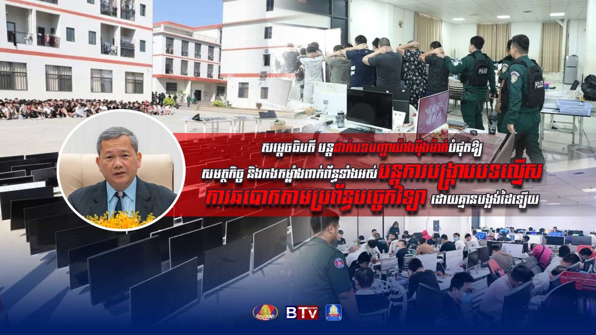 សម្តេចធិបតី បន្តដាក់បទបញ្ជាយ៉ាងម៉ឺងម៉ាត់បំផុតឱ្យសមត្ថកិច្ច និងកងកម្លាំងពាក់ព័ន្ធទាំងអស់បន្តការបង្ក្រាបបទល្មើសការឆបោកតាមប្រព័ន្ធបច្ចេកវិទ្យាដោយគ្មានបង្អង់ដៃឡើយ