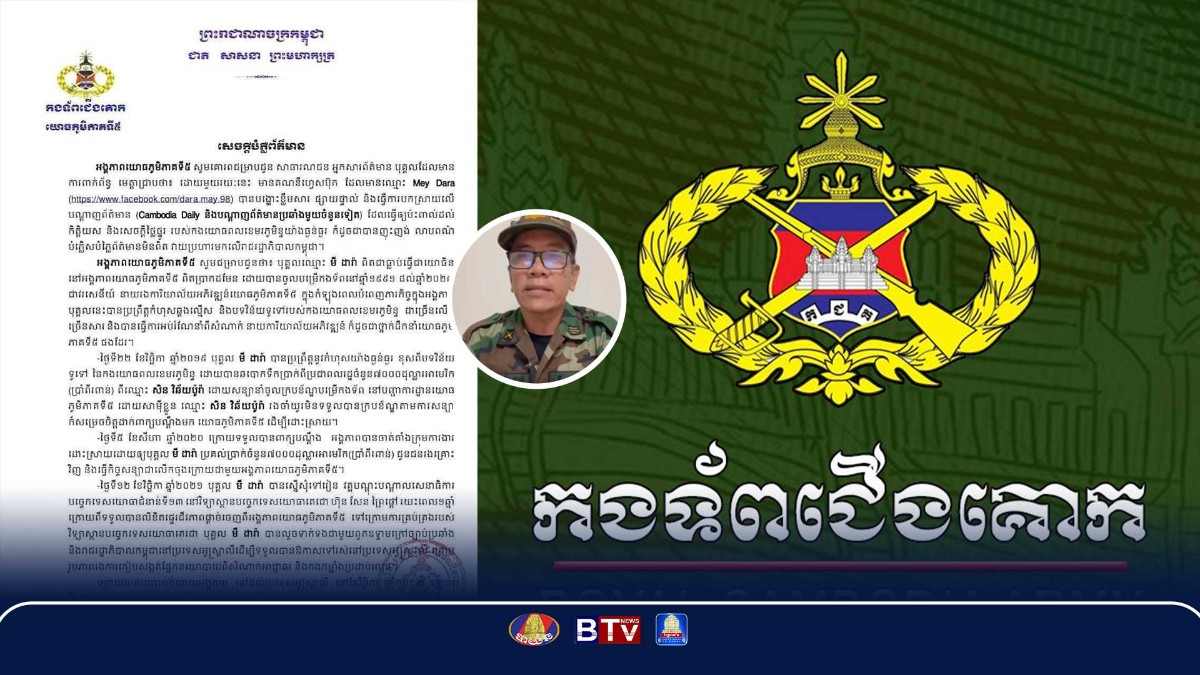 យោធភូមិភាគទី៥ នៃកងទ័ពជើងគោកកម្ពុជា បានឲ្យដឹងថា ដើម្បីចង់បានសិទ្ធិជ្រកកោណ នៅ​ប្រទេស​អូស្ត្រាលី បុគ្គល មី ដារ៉ា ដែលជាអតីតនាយទាហានខ្មែរនៅយោធភូមិភាគទី៥ បាន​ប្រព្រឹត្ត​បទ​ល្មើស​វិន័យ​កងទ័ពជាច្រើន ដូចជាបោកប្រាក់ប្រជាពលរដ្ឋ ដើម្បីនាំ​ចូល​ក្រប​ខណ្ឌ​បម្រើ​កង​ទ័ព។ មិនតែប៉ុណ្ណោះ បុគ្គលនេះ បានយកឡេស​ធ្វើ​ការ​វាយ​ប្រហារ​ដល់​រាជ​រដ្ឋាភិបាល​ដើម្បី​ទទួលបាន​ឱកាស​ទៅ​រស់​នៅ​ប្រទេស​អូស្ត្រាលី​ក្រោម​រូបភាព​រង​ការ​កៀប​សង្កត់​ផ្នែក​នយោបាយ​ពី​សំណាក់អាជ្ញាធរ និងកងកម្លាំងប្រដាប់អាវុធជាដើម។យោងតាមសេចក្តីបំភ្លឺព័ត៌មានរបស់អង្គភាពយោធភូមិភាគទី៥ កងទ័ពជើងគោកនៃកងយោធពល ខេមរភូមិន្ទ បានឲ្យដឹងថា ដោយមួយរយៈនេះ មានគណនីហ្វេសប៊ុក ដែលមានឈ្មោះ Mey Dara បានបង្ហោះខ្លឹមសារផ្សាយផ្ទាល់ និងធ្វើការបកស្រាយលើបណ្តាញព័ត៌មានបម្រើឲ្យបរទេស និង​បណ្ដាញ​ព័ត៌មានប្រឆាំងមួយចំនួនទៀត ដែលធ្វើឲ្យប៉ះពាល់ដល់កិត្តិយស និងសេចក្ដីថ្លៃថ្នូរ របស់​កងយោធពលខេមរភូមិន្ទយ៉ាងធ្ងន់ធ្ងរ ក៏ដូចជាបានញុះញង់ លាបពណ៌ បំផ្លើស​បំភ្លៃ​ព័ត៌មាន​មិន​ពិត​ វាយប្រហារមកលើរាជរដ្ឋាភិបាលកម្ពុជា។យោភូមិភាគទី៥ បានបញ្ជាក់ថា បុគ្គលឈ្មោះ មី ដារ៉ា ពិតជាធ្លាប់ធ្វើជាយោធិន នៅ​អង្គភាព​យោធ​ភូមិ​ភាគទី៥ ពិតប្រាកដមែន ដោយបានចូលបម្រើកងទ័ពនៅឆ្នាំ១៩៩១ ដល់ឆ្នាំ២០២៣ ជា​វរសេនីយ៍ នាយរងការិយាល័យអភិវឌ្ឍន៍យោធភូមិភាគទី៥ ប៉ុន្តែ​ក្នុង​កំឡុង​ពេល​បំពេញ​ភារកិច្ច​ក្នុង​អង្គភាពបុគ្គលនេះបានប្រព្រឹត្តកំហុសឆ្គងល្មើស និងបទវិន័យទូទៅ​របស់ក​ង​យោធពល​ខេម​រភូមិ​ន្ទ​ជា​ច្រើនលើក ច្រើនសារ និងបានធ្វើការអប់រំណែនាំពីសំណាក់នាយការិយាល័យអភិវឌ្ឍន៍ ក៏​ដូចជាថ្នាក់ដឹកនាំយោធភូមិ ភាគទី៥ផងដែរ។អង្គភាពយោធភូមិភាគទី៥ បានបញ្ជាក់ទៀតថា នៅថ្ងៃទី២២ ខែវិច្ឆិកា ឆ្នាំ២០១៩ បុគ្គល មី ដារ៉ា បាន​ប្រព្រឹត្តនូវកំហុសយ៉ាងធ្ងន់ធ្ងរ ខុសពីបទវិន័យទូទៅ នៃកងយោធពលខេមរភូមិន្ទ ដោយ​បាន​ឆបោក​ទឹក​ប្រាក់ពីប្រជាពលរដ្ឋចំនួន៧០០០ដុល្លារអាមេរិក (ប្រាំពីរពាន់) ពីឈ្មោះ សិន វិឆ័យ​ប៉ូរ៉ា ដោយសន្យានាំចូលក្របខ័ណ្ឌបម្រើកងទ័ព នៅបញ្ហាការដ្ឋានយោធភូមិភាគទី៥ ដោយ​សាម៉ី​ខ្លួន ឈ្មោះ សិន វិឆ័យប៉ូរ៉ា រងចាំយូរមិនទទួលបានក្របខ័ណ្ឌតាមការសន្យា ក៏សម្រេច​ចិត្ត​ដាក់​ពាក្យ​បណ្តឹង​មកយោធភូមិភាគទី៥ ដើម្បីដោះស្រាយ។ ថ្ងៃទី៥ ខែសីហា ឆ្នាំ២០២០ ក្រោយ​ទទួល​បាន​ពាក្យ​បណ្តឹង អង្គភាពបានចាត់តាំងក្រុមការងារដោះស្រាយដោយឲ្យបុគ្គល មី ដារ៉ា ប្រគល់​ប្រាក់​ចំនួន៧០០០ដុល្លារអាមេរិក(ប្រាំពីរពាន់) ជូនជនរងគ្រោះវិញ និងធ្វើកិច្ច​សន្យា​ជា​លើក​ចុង​ក្រោយ​ជាមួយអង្គភាពយោធភូមិភាគទី៥។ដោយឡែក
