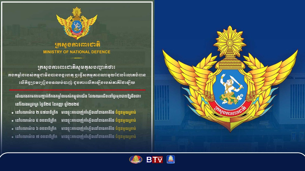 លោកជំទាវ ឧត្តមសេនីយ៍ឯក ម៉ាលី សុជាតា អ្នកនាំពាក្យក្រសួងការពារជាតិ នៃ​ព្រះរាជា​ណា​ចក្រ​កម្ពុជា បានឲ្យដឹងថា នៅព្រឹកថ្ងៃទី២៥ ខែកញ្ញា ឆ្នាំ២០២៥ មានផេកផ្លូវការ​របស់​កង​ទ័ព​ជើង​គោក​ថៃ និងសារព័ត៌មានរបស់ថៃមួយចំនួនបានចុះផ្សាយថា “កម្ពុជាបង្ក​ហេតុ​ពេញ​មួយ​យប់​នៅ​តំបន់​យោធ​ភូមិភាគទី២” ដោយឮសម្លេងកាំភ្លើង, សំឡេង​ផ្ទុះគ្រាប់បែក, រកឃើញ​ការ​ចូល​ជិត​លួស​​បន្លា​​ហើយការបាញ់ ដើម្បីពិនិត្យមើលរយៈចម្ងាយ។ក្រសួងការពារជាតិ នៃព្រះរាជាណាចក្រកម្ពុជាស្រាយបំភ្លឺថា កង​កម្លាំង​របស់​កម្ពុជា​មិន​បាន​បង្ក​ហេតុ​ ឬ​ធ្វើ​សកម្មភាព​ណា​មួយ​ដែលរំលោភបំពានលើកិច្ចព្រមព្រៀងបទ​ឈប់បាញ់ ដូច​ការ​លើក​ឡើង​របស់​ភាគីថៃឡើយ។បើយោងតាមការបញ្ជាក់ពីកងកម្លាំងរបស់កម្ពុជាដែលឈរជើងនៅជួរមុខបានឱ្យដឹងថា នៅរំលងអធ្រាត្រ ថ្ងៃទី២៥ ខែកញ្ញា ឆ្នាំ២០២៥• នៅវេលាម៉ោង ២:៥៧នាទីព្រឹក មានផ្ទុះការបាញ់កាំភ្លើងនៅខាងភាគីថៃ ចំនួនមួយគ្រាប់ • នៅវេលាម៉ោង ៥:០០នាទីព្រឹក មានផ្ទុះការបាញ់កាំភ្លើងនៅខាងភាគីថៃ ចំនួនមួយគ្រាប់• នៅវេលាម៉ោង ៦:០០នាទីព្រឹក មានផ្ទុះការបាញ់កាំភ្លើងនៅខាងភាគីថៃ ចំនួនមួយគ្រាប់ • នៅវេលាម៉ោង ៧:០០នាទីព្រឹក មានផ្ទុះការបាញ់កាំភ្លើងនៅខាងភាគីថៃ ចំនួនមួយគ្រាប់កង​កម្លាំង​របស់​កម្ពុជា សូមបញ្ជាក់សាជាថ្មីនូវការប្តេជ្ញាចិត្តយ៉ាងពេញលេញ ចំពោះការគោរព និង​អនុវត្ត​នូវ​កិច្ច​ព្រមព្រៀងនៃបទឈប់បាញ់រវាងយោធាកម្ពុជា និងយោធាថៃ បានយ៉ាងម៉ឺងម៉ាត់ និង​ខ្ជាប់​ខ្ជួន​បំផុត ជាមួយនឹងស្មារតីនៃការប្តេជ្ញាចិត្តក្នុងការសហការគ្នានៅគ្រប់កម្រិត កម្ពុជា​តែង​តែ​រក្សា​នូវ​កិច្ចសហការល្អជាមួយគ្នា។ ក្នុងនោះផងដែរ ក្រុមទំនាក់ទំនងរវាងកម្ពុជា-ថៃ នៅជួរមុខ គឺ​បានធ្វើការជាមួយគ្នាជាប់ជាប្រចាំ តាមរយៈការផ្តល់ព័ត៌មាន ឬការបញ្ជាក់គ្នាទៅវិញទៅមក ដើម្បី​​ចៀស​វាង​ការភាន់ច្រឡំ ឬការបង្កភាពតានតឹងណាមួយដែលមិនចាំបាច់។