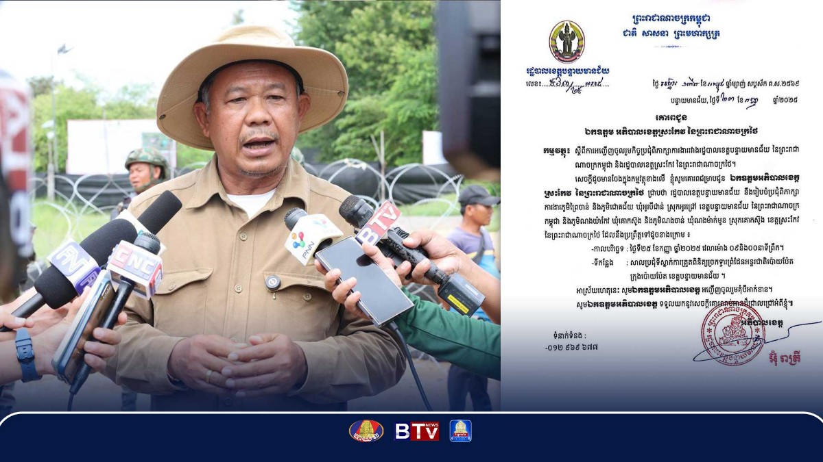 ឯកឧត្តម អ៊ុំ រាត្រី អភិបាលនៃគណៈអភិបាលខេត្តបន្ទាយមានជ័យ បាន​ស្នើ​ឱ្យ​ភាគី​ថៃ​ចូល​រួម​ជា​មួយ​កម្ពុជា​អនុវត្តឱ្យបានម៉ឺងម៉ាត់នូវស្មារតីនៃកិច្ចប្រជុំពិសេសគណៈកម្មាធិការព្រំដែនទូទៅ (GBC) នាថ្ងៃទី ១០ ខែកញ្ញា ឆ្នាំ២០២៥ ចំណុច ៨.១ បានប្រគល់ភារកិច្ច ឱ្យខេត្ត​បន្ទាយ​មានជ័យរបស់កម្ពុជា និងខេត្តស្រះកែវរបស់ថៃ សម្របសម្រួលជាមួយគ្នា ដើម្បី​គ្រប់​គ្រង​ស្ថាន​ការណ៍នៅ​ទី​តាំងផ្ទាល់ប្រកបដោយសន្តិវិធី រួមបញ្ចូលទាំងការបញ្ឈប់​រាល់​សកម្មភាព​ដែល​ពង្រីក​ទំហំ​វិវាទ និងបង្កើនភាពតានតឹង ដោយរង់ចាំដំណោះស្រាយរបស់គណៈកម្មការ​ចម្រុះ​ខណ្ឌ​សីមា​ព្រំដែន​គោក (JBC) នៃប្រទេសទាំងពីរ។ ការស្នើរបស់ឯកឧត្តម អ៊ុំ រាត្រី ធ្វើឡើងនៅ ថ្ងៃទី២៥ ខែកញ្ញា ឆ្នាំ២០២៥ នេះ ក្រោយមិនមានការឆ្លើយតបពីអភិបាលខេត្តស្រះកែវចំពោះលិខិតអញ្ជើញកាលពីថ្ងៃទី២៣ ខែកញ្ញា ឆ្នាំ២០២៥ របស់អភិបាលខេត្តបន្ទាយដើម្បីជួបប្រជុំពិភាក្សាការងាររវាងរដ្ឋបាលខេត្តបន្ទាយមានជ័យ និងខេត្តស្រះកែវទាក់ទងនឹងភូមិព្រៃចាន់ និងភូមិជោគជ័យ ឃុំអូរបីជាន់ ស្រុកអូរជ្រៅ ខេត្តបន្ទាយមានជ័យ នៃព្រះរាជាណាចក្រកម្ពុជា និងភូមិណងយ៉ាកែវ ឃុំគោកស៊ូង និងភូមិណងចាន់ ឃុំណងម៉ាក់មូន ស្រុកគោកស៊ូង ខេត្តស្រះកែវ នៃព្រះរាជាណាចក្រថៃ។ឯកឧត្តម អ៊ុំ រាត្រី បានមានប្រសាសន៍ថា កន្លងទៅនេះ យើងសង្កេតឃើញថា មានអ្នកនាំពាក្យរងនៃកងទ័ពភូមិន្ទថៃ រដ្ឋបាលខេត្តស្រះកែវ ក៏ដូចជាបណ្តាញព័ត៌មានថៃមួយចំនួនបានបង្ហាញ និងផ្សព្វផ្សាយដល់សាធា រណជនជាតិ និងអន្តរជាតិ អំពីផែនទីរូបភាពផ្កាយរណប និងប្លង់ទីតាំងបង្គោលព្រំដែន នៅតំបន់ភូមិព្រៃចាន់ និងភូមិជោគជ័យ ដោយប្រើប្រាស់ឯកសារ និងព័ត៌មានទ្វេភាគីមួយចំនួន យកមកបកស្រាយប្រាស់ចាកពីការពិត។ ទោះបីជាផ្អែកទៅលើខ្សែមិនផ្លូវការ ដែលគូសនៅលើផែនទីរូបភាពផ្កាយរណប ជាឯកតោភាគីរបស់ថៃនៅចន្លោះបង្គោលព្រំដែនលេខ៤២ និងលេខ៤៣ និងចន្លោះបង្គោលព្រំដែនលេខ ៤៤ ដល់បង្គោលព្រំដែនលេខ ៤៧ នេះក៏ដោយ ក៏យើងអាចសង្កេតឃើញថា ការអង្កេតនៅលើដីជាក់ស្តែង បានបង្ហាញ និងបញ្ជាក់ច្បាស់ថា ក៏មានការកាន់កាប់ និងអាស្រ័យផលជាក់ស្តែងរបស់ប្រជាពលរដ្ឋថៃចូលមកកម្ពុជាវិញផងដែរ។ឯកឧត្តមអភិបាលខេត្តបន្ទាយមានជ័យ បានថ្លែងថា បញ្ហាទាំងអស់នេះបង្ហាញឱ្យឃើញពីភាពស្មុគ្រស្មាញ និងការលំបាកនៅក្នុងការងារដោះស្រាយបញ្ហាព្រំដែន ដែលទាមទារឱ្យគោរពទៅតាមកិច្ចព្រមព្រៀង និងគោលការណ៍ទាំងឡាយដែលភាគីទាំងពីរបានឯកភាពគ្នាកន្លងមក។ក្នុងន័យនេះ ខ្ញុំសូមស្នើឱ្យភាគីថៃចូលរួមជាមួយកម្ពុជាអនុវត្តឱ្យបានម៉ឺងម៉ាត់នូវស្មារតីនៃកិច្ចប្រជុំពិសេសគណៈកម្មាធិការព្រំដែនទូទៅ (GBC)។ ជាមួយគ្នានេះ ឯកឧត្តមអភិបាល