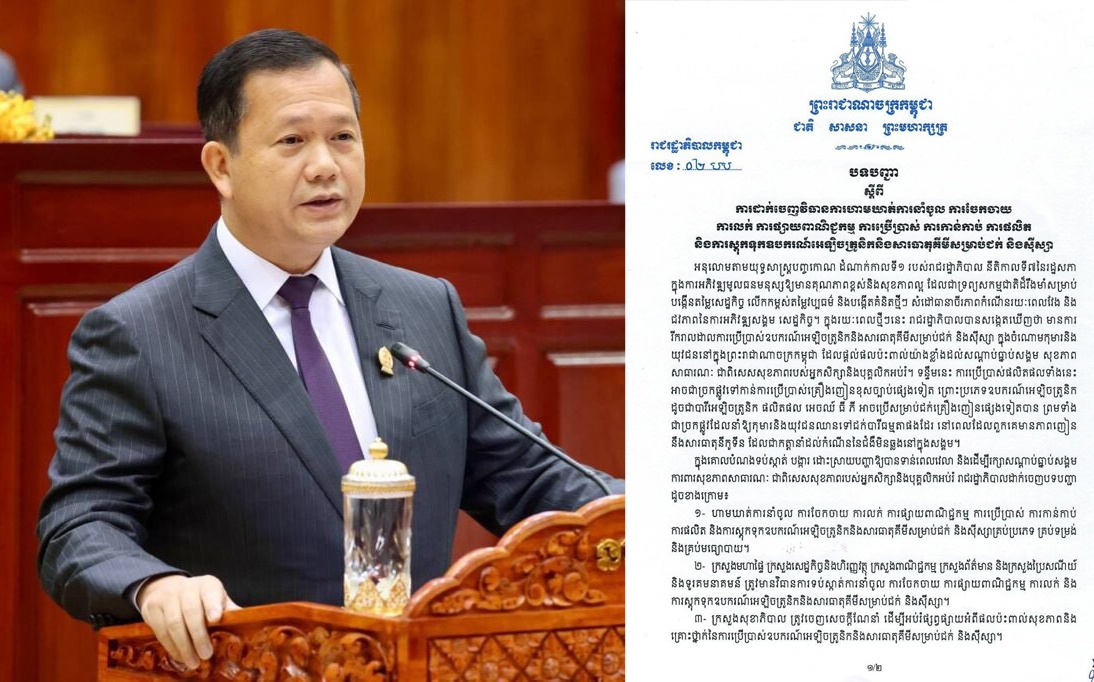 សម្ដេចធិបតី ហាមឃាត់ការនាំចូល ការលក់ ការប្រើប្រាស់ ការស្តុកទុក និងការផ្សាយពាណិជ្ជកម្មឧបករណ៍អេឡិចត្រូនិកសម្រាប់ជក់ និងស៊ីស្សា