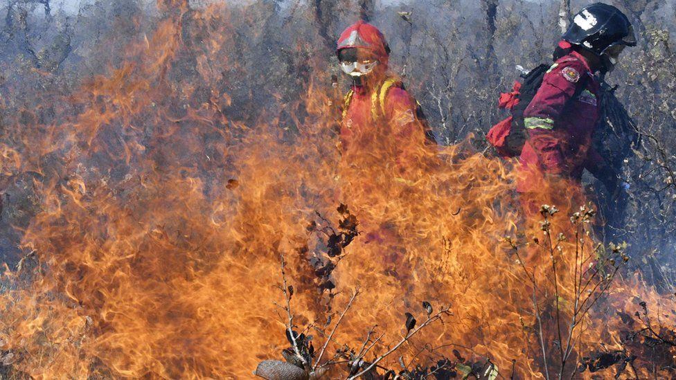 ភ្លើងឆេះព្រៃទ្រង់ទ្រាយធំ បានឆាបឆេះតំបន់អភិរក្សព្រៃឈើរាប់ពាន់ហិចតានៅប្រទេសបូលីវី ស្របពេលដែលក្រុមភ្នាក់ងារពន្លត់អគ្គិភ័យ កំពុងព្យាយាមពន្លត់អណ្តាតភ្លើង ។ រូបភាពវីដេអូឃ្លីបថតបានអណ្តាតភ្លើងកំពុងឆាបឆេះតំបន់អភិរក្សព្រៃឈើ Nembi Guasu ។ យោងតាមសេចក្តីរាយការណ៍ បានឲ្យដឹងថា ដីព្រៃទំហំជាង ៥ពាន់ហិចតា ត្រូវបានបំផ្លិចបំផ្លាញដោយសារភ្លើងឆេះព្រៃ ។ តំបន់អភិរក្សព្រៃឈើ Nembi Guasu ស្ថិតនៅក្នុងចំណោមតំបន់ចំនួន ៣ដែលកើតមានករណីភ្លើងឆេះព្រៃដ៏សកម្ម នៅតំបន់ Santa Cruz ។ ឧទ្ធម្ភាគចក្រ ត្រូវបានប្រើប្រាស់ ដើម្បីជួយក្រុមភ្នាក់ងារពន្លត់អគ្គិភ័យ និងក្រុមអាជ្ញាធរនៅដី ។ លោក Israel Riveraគឺជាមន្រ្តីរដ្ឋបាលក្រុង San José de Chiquitos និយាយថា ពួកយើងបានកាត់បន្ថយភ្លើងឆេះព្រៃ ពេលដែលពួកយើងព្យាយាមពន្លត់វា ប៉ុន្តែក្រោយមក ភ្លើងឆេះព្រៃថ្មីក៏បានចាប់ផ្តើមកើតមាននៅផ្នែកម្ខាងទៀត ។ លោកបន្តថា ពួកយើងមានការព្រួយបារម្ភខ្លាំងណាស់ចំពោះសហគមន៍កសិកម្ម ដែលទើបបង្កើតឡើងកាលពីពេលថ្មីៗនេះ ដោយសារតែពួកគេពុំអាចគ្រប់គ្រងស្ថានការការងាររបស់ពួកគេបានទេ ជាមួយនឹងភ្លើងឆេះព្រៃបែបនេះ ៕