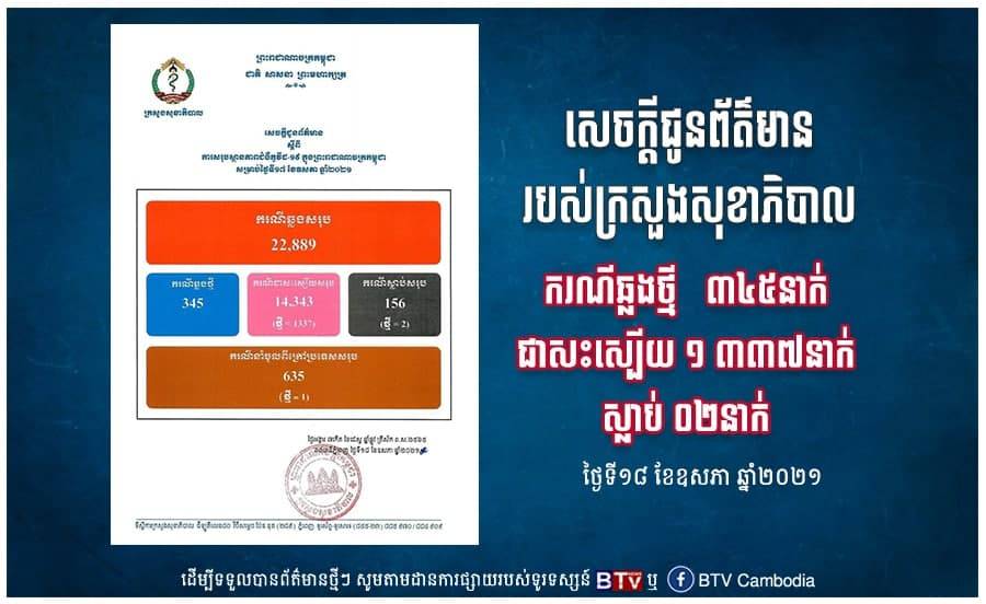 ភ្នំពេញ៖ ក្រសួង​សុខាភិបាល​បាន​ប្រកាស​នៅ​ថ្ងៃ​នេះ​ថា មនុស្ស ២​នាក់​ទៀត បាន​ស្លាប់​ដោយសារ​ជំងឺ​កូវីដ-១៩ ខណៈ​មនុស្ស ៣៤៥​នាក់​ទៀត ត្រូវ​បាន​រក​ឃើញ​ឆ្លង​មេរោគ​ផ្លូវ​ដង្ហើម​មួយ​នេះ។ក្នុង​សេចក្ដី​ប្រកាស​ព័ត៌មាន​នៅ​ថ្ងៃ​នេះ ក្រសួង​សុខាភិបាល​បញ្ជាក់​ថា តួលេខ​អ្នក​ស្លាប់​ដោយសារជំងឺកូវីដ-១៩​សរុប កើន​ដល់ ១៥៦​នាក់​ហើយ​នៅ​ក្នុង​រយៈ​ ៦៨​ថ្ងៃ​កន្លង​មក​នេះ ក្នុង​នោះ​មាន​ទាំង​ករណី​ស្លាប់​ថ្មី ២​នាក់​ទៀត ដែល​ក្រសួង​ប្រកាស​នៅ​ថ្ងៃ​នេះ​ផង​ដែរ។ក្រសួង​សុខាភិបាល​ឱ្យ​ដឹង​ទៀត​ថា មនុស្ស ៣៤៥​នាក់​ផ្សេង​ទៀត ត្រូវ​បាន​រក​ឃើញ​ឆ្លង​មេរោគ​កូវីដ-១៩ ដែល​នាំ​ឱ្យ​តួលេខ​អ្នក​ឆ្លង​សរុប​នៅ​ទូទាំង​ប្រទេស​កើន​ឡើង​ដល់ ២២ ៨៨៩​នាក់​ហើយ​គិត​ត្រឹម​ថ្ងៃ​នេះ។បើ​តាម​ក្រសួង​សុខាភិបាល ករណី​ឆ្លង​ថ្មី​​ចំនួន ៣៤៤​នាក់ បាន​ឆ្លង​មេរោគ​កូវីដ-១៩​នេះ បន្ទាប់​ពី​ពួកគេ​ពាក់​ព័ន្ធ​នឹង​ព្រឹត្តិការណ៍​សហគមន៍​២០​កុម្ភៈ ហើយ ១​ករណី​ទៀត គឺ​ជា​ករណី​នាំ​ចូល។ក្រសួង​សុខាភិបាល​បាន​ឱ្យ​ដឹង​ផង​ដែរ​ថា អ្នក​ជំងឺ​កូវីដ-១៩​សរុប ១៤ ៣៤៣​នាក់​ហើយ ត្រូវ​បាន​ព្យាបាល​ជា​សះ​ស្បើយ ក្នុង​នោះ​មាន​ទាំង​អ្នក​ជា​សះ​ស្បើយ​ថ្មី​ចំនួន ១ ៣៣៧​នាក់ ដែល​ក្រសួង​ប្រកាស​នៅ​ថ្ងៃ​នេះ​ផងដែរ៕