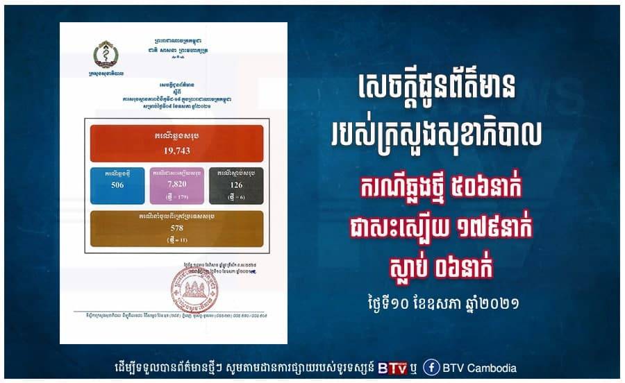 ភ្នំពេញ៖ ក្រសួង​សុខាភិបាល​ បាន​ប្រកាស​ថា មនុស្ស​ដល់​ទៅ ៥០៦​នាក់​បន្ថែម​ទៀត ត្រូវ​បាន​រក​ឃើញ​ឆ្លង​មេរោគ​កូវីដ​១៩ ដែល​នាំ​ឱ្យ​ចំនួន​ឆ្លង​សរុប​កើនឡើង​ជិត​ ២​ម៉ឺន​នាក់​ហើយ​នៅ​ត្រឹម​ថ្ងៃ​នេះ។ក្នុង​សេចក្ដី​ប្រកាស​ព័ត៌មាន​នៅ​ថ្ងៃ​នេះ ក្រសួង​សុខាភិបាល​បញ្ជាក់​ថា ករណី​ឆ្លង​​ថ្មី​ដល់​ទៅ ៤៩៥​នាក់ សុទ្ធ​តែ​ពាក់​ព័ន្ធ​នឹង​ព្រឹត្តិការណ៍​សហគមន៍ ២០​កុម្ភៈ ហើយ​អ្នក​ឆ្លង​ថ្មី ១១​នាក់​ទៀត គឺ​ជា​ករណី​នាំ​ចូល​ពី​ក្រៅ​ប្រទេស។គិត​ត្រឹម​ថ្ងៃ​នេះ កម្ពុជា​រក​ឃើញ​អ្នក​ឆ្លង​សរុប​​កើន​ឡើង​ដល់ ១៩ ៧៤៣​នាក់​គិត​ចាប់​តាំង​ពី​កម្ពុជា ​រក​ឃើញ​ករណី​ឆ្លង​លើក​ដំបូង​កាល​ពី​ថ្ងៃ​ទី​២៧ ខែ​មករា ឆ្នាំ​២០២០​មក។​ ទន្ទឹម​គ្នា​នេះ ក្រសួង​សុខាភិបាល​ប្រកាស​ថា ​អ្នក​ជំងឺ​កូវីដ-១៩​សរុប ៧ ៨២០​នាក់ បាន​ជា​សះ​ស្បើយ​ពី​ជំងឺ​ផ្លូវ​ដង្ហើម​នេះ ក្នុង​នោះ​មាន​ទាំង​អ្នក​ជា​សះ​ស្បើយ​ថ្មី ១៧៩​នាក់ ដែល​ក្រសួង​ប្រកាស​នៅ​ថ្ងៃ​នេះ​ផង​ដែរ។ចំណែក​តួលេខ​អ្នក​ស្លាប់​វិញ ក្រសួង​សុខាភិបាល​បញ្ជាក់​ថា បាន​កើន​ឡើង​ដល់ ១២៦​នាក់​ហើយក្នុង​នោះ​មាន​មនុស្ស ៦​នាក់​ទៀត​បាន​ស្លាប់​ដែល​ក្រសួង​ប្រកាស​នៅ​ថ្ងៃ​នេះ៕