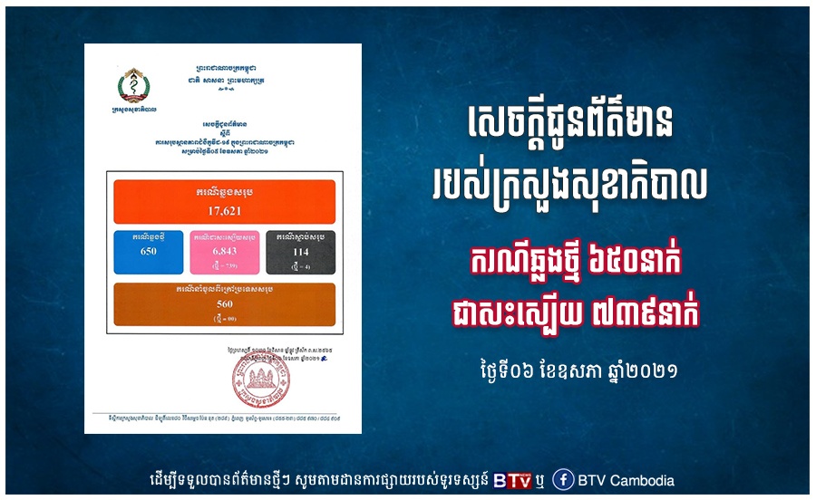 ភ្នំពេញ ៖ ក្រសួង​សុខាភិបាល​ បាន​ប្រកាស​នៅ​ថ្ងៃ​នេះ មនុស្ស ៤នាក់​ទៀត បាន​ស្លាប់​ដោយសារ​ជំងឺ​កូវីដ-១៩​ ខណៈ​មនុស្ស ៦៥០​នាក់​ទៀត ត្រូវ​បាន​រកឃើញ​ឆ្លង​មេរោគ​កូវីដ-១៩។ក្នុង​សេចក្ដី​ប្រកាស​ព័ត៌មាន​នៅ​ថ្ងៃ​នេះ ក្រសួង​សុខាភិបាល​​បញ្ជាក់​ថា ករណី​ឆ្លង​ថ្មី​ទាំង​អស់ ​សុទ្ធ​តែ​ពាក់​ព័ន្ធ​នឹង​ព្រឹត្តិការណ៍​សហគមន៍ ២០​កុម្ភៈ​។ក្រសួង​សុខាភិបាល​ឱ្យ​ដឹង​ទៀតថា អ្នក​ជំងឺ​កូវីដ-១៩​ចំនួន ៧៣៩​នាក់​ទៀត បាន​ជាសះ​ស្បើយ​ពី​​ជំងឺ​ ហើយ​ត្រូវ​បាន​អនុញ្ញាតឱ្យ​ចាក​ចេញ​ពី​មណ្ឌល​ព្យាបាល ដែលនាំ​ឱ្យ​តួលេខ​អ្នក​ជា​សះ​ស្បើយ​ឡើងដល់ ៦ ៨៤៣​នាក់។គិត​ត្រឹម​ថ្ងៃ​នេះ កម្ពុជា​រក​ឃើញ​មនុស្ស​សរុប​ដល់​ទៅ ១៧ ៦២១​នាក់​ហើយ​បាន​ឆ្លង​មេរោគ​កូវីដ-១៩​នៅ​ទូទាំង​ប្រទេស​ចាប់​តាំង​ពី​ប្រទេស​នេះ​រក​ឃើញ​ករណី​ឆ្លង​ដំបូង​កាល​ពី​ចុង​ខែ​មករា​ឆ្នាំ​២០២០​មក៕