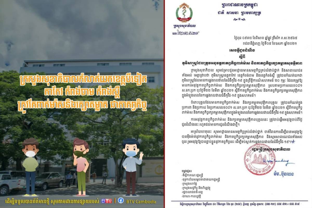 ក្រសួង​សុខាភិបាល​ តម្រូវ​ឱ្យ​ប្រជាជន​នៅ​ខេត្ត​កំពង់ចាម កំពង់ស្ពឺ និង​តាកែវ ពាក់​ម៉ាស និង​រក្សា​គម្លាត​សុវត្ថិភាព