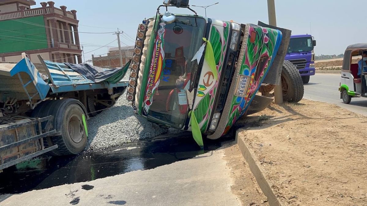 រថយន្តធន់ធំ២គ្រឿង ដឹកថ្ម បើកជែងគៀគ្នាក្រឡាប់ផ្ងាជើង ចាក់ថ្មរាយពេញផ្លូវ