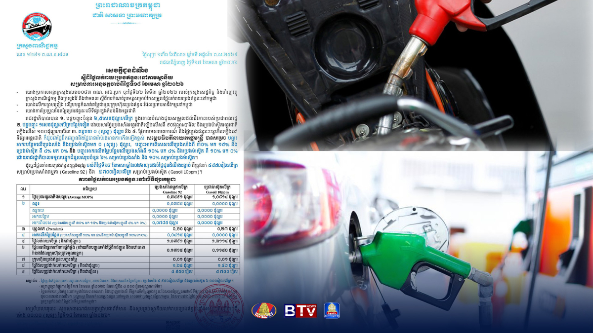 ថ្លៃលក់រាយប្រេងសាំង និងម៉ាស៊ូត បន្តធ្លាក់ចុះ ខណៈរដ្ឋបន្តទម្លាក់ពន្ធដល់សូន្យ% ដើម្បីជួយពលរដ្ឋ