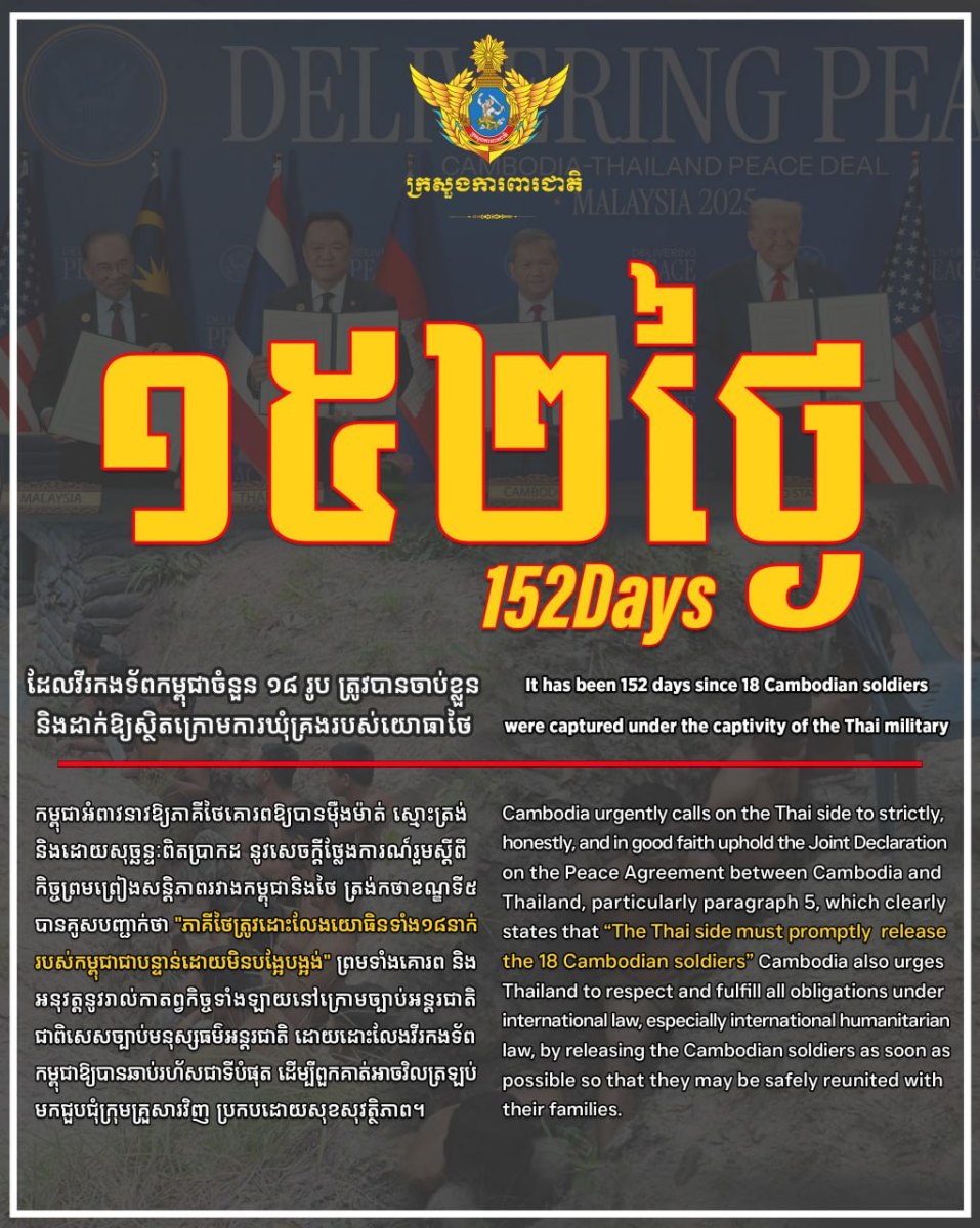 ថ្ងៃនេះជា ថ្ងៃទី១៥២ ហើយ ដែលវីរកងទ័ពកម្ពុជាចំនួន១៨រូប ត្រូវបានចាប់ខ្លួន និងដាក់ឱ្យស្ថិតក្រោមការឃុំគ្រងរបស់យោធាថៃ។